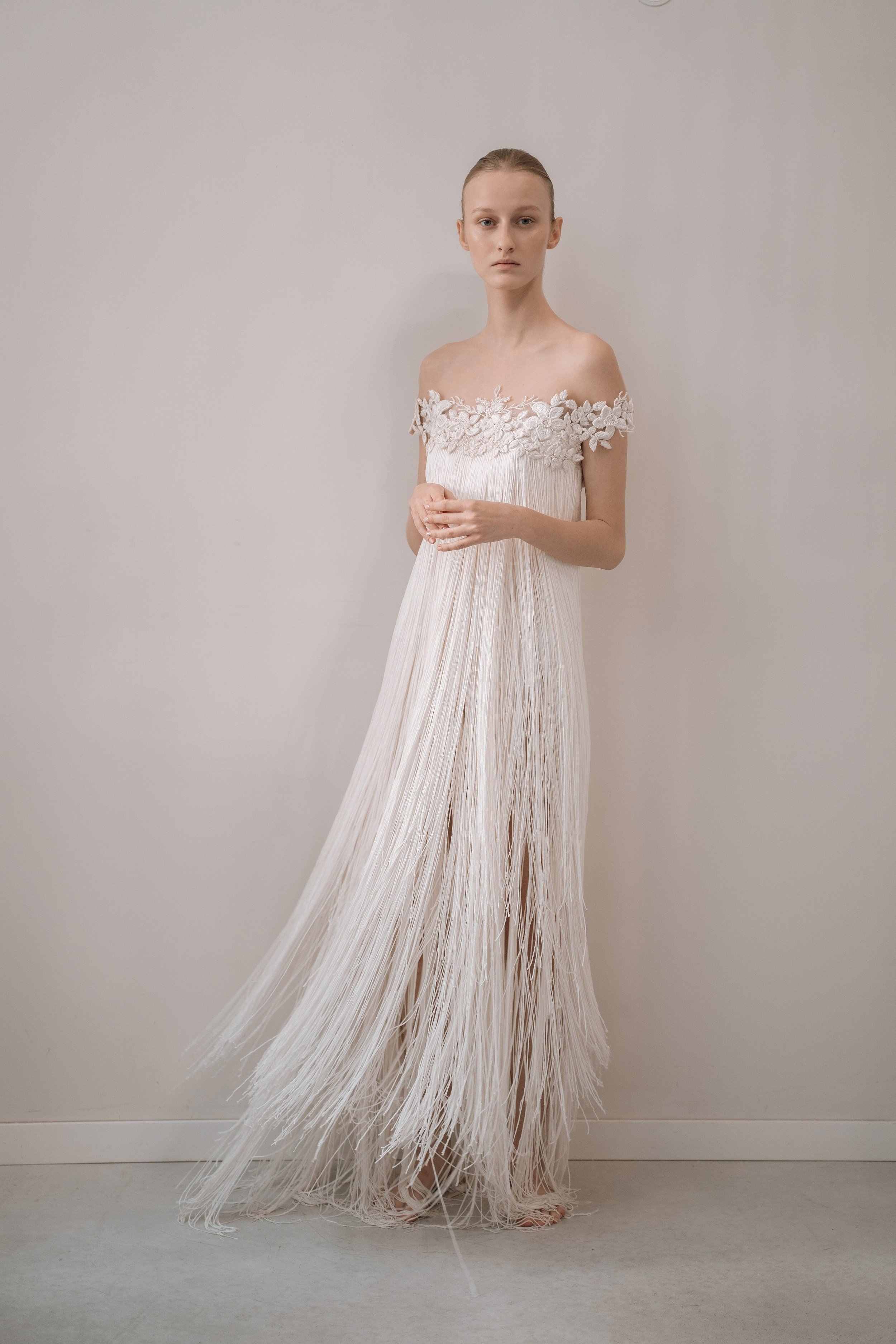 The fringe-filled wedding dress is an untraditional take on classic bridal gowns that reflects the sensibilities of the modern bride. She’s someone who has the courage to be whisked away by love without fearing that she will lose herself in it. This idea is paralleled by the fringe’s cut-loose swoosh effect and the wearer’s ability to control its movements.