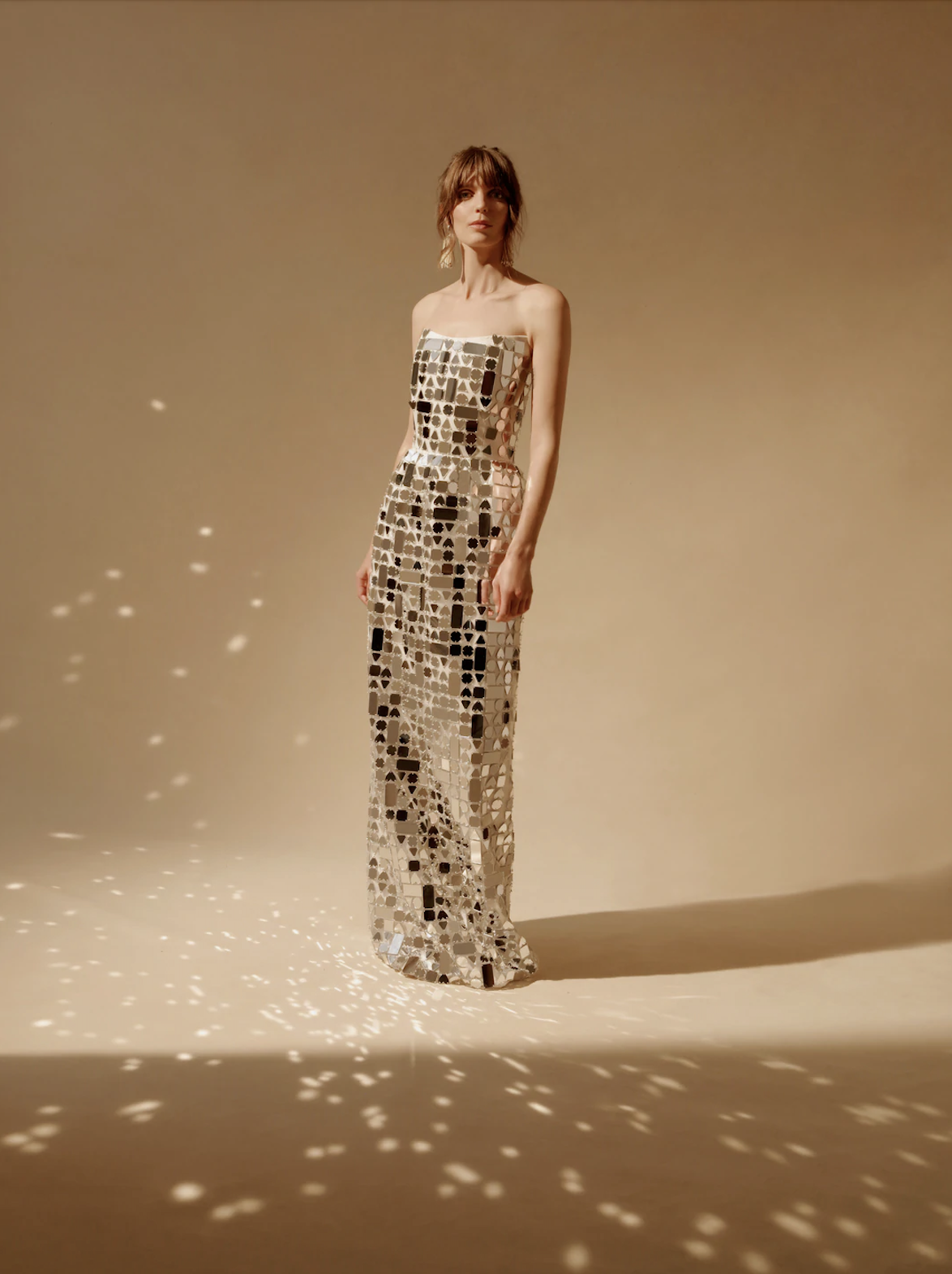 Mirror appliqué detailing is an exciting twist on the black-tie dress code. These gowns are climbing up the ladder as “night-luxe” (an elevated party girl aesthetic) increases in popularity. It’s perfect for the bride who will spend the night celebrating with a ring on one hand and a lipstick-stained cocktail glass in the other.