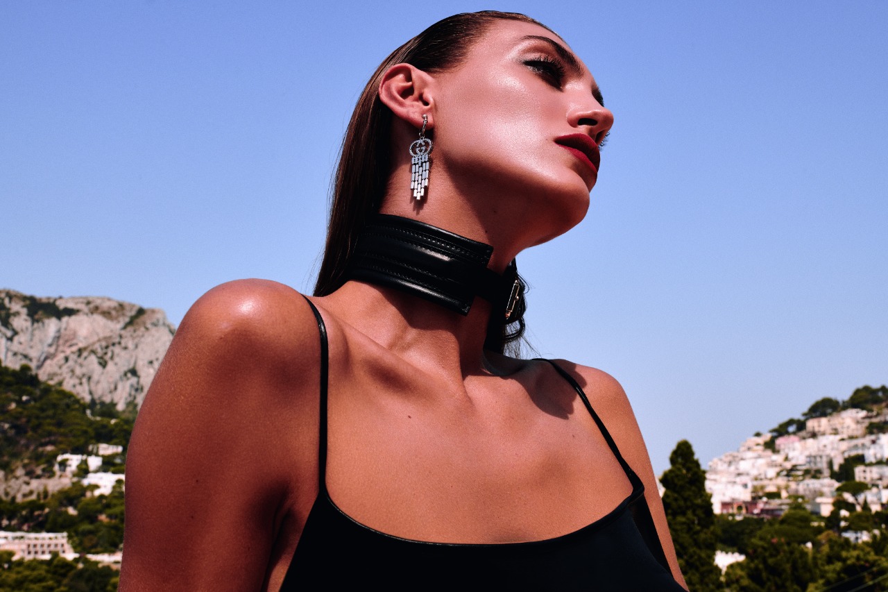 Leather Belt Necklace, GG Crystals Earrings, GUCCI