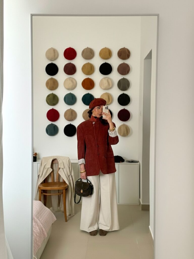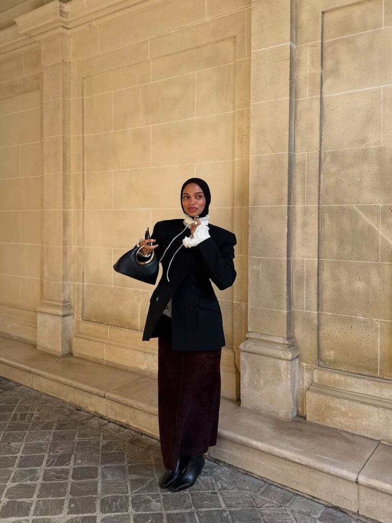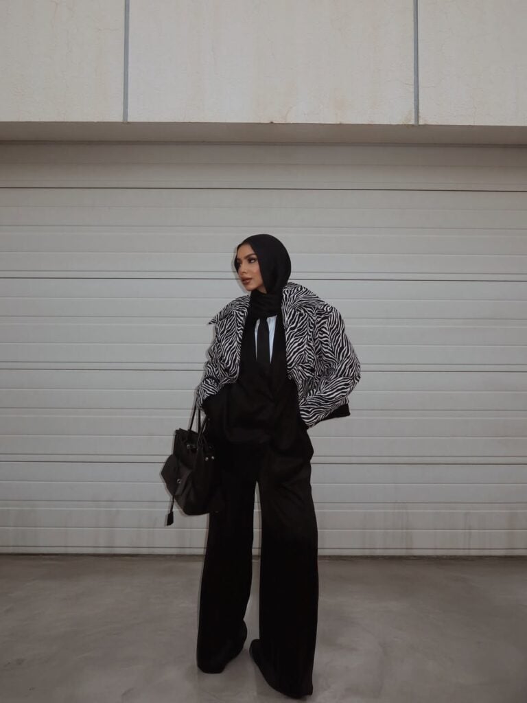 For Tasneem, simple is the way to go about this season. If you’re ever on the hunt for a more polished attire, look no further than this Dubai creator’s fits. This time, she opted for a jacquard-knit cardigan in navy blue with flared trousers and square-toed boots. Adding a pop of colour, she accessorised her outfit with a burgundy shoulder bag.