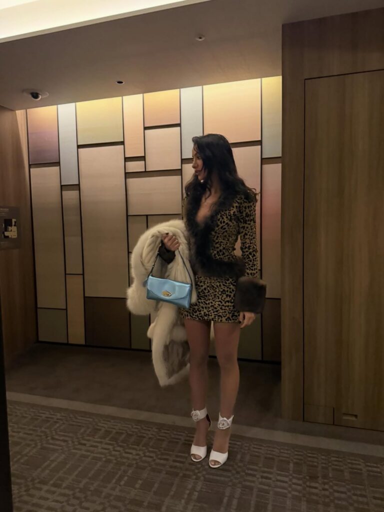 Bringing that très chic energy to Dubai, Salima has embraced the cooler climes with an orange-brown corduroy blazer paired with off-white palazzos. She accessorised with a Demillier Sienna Bag, matching her fluffy uggs, and a barrette to top it all.