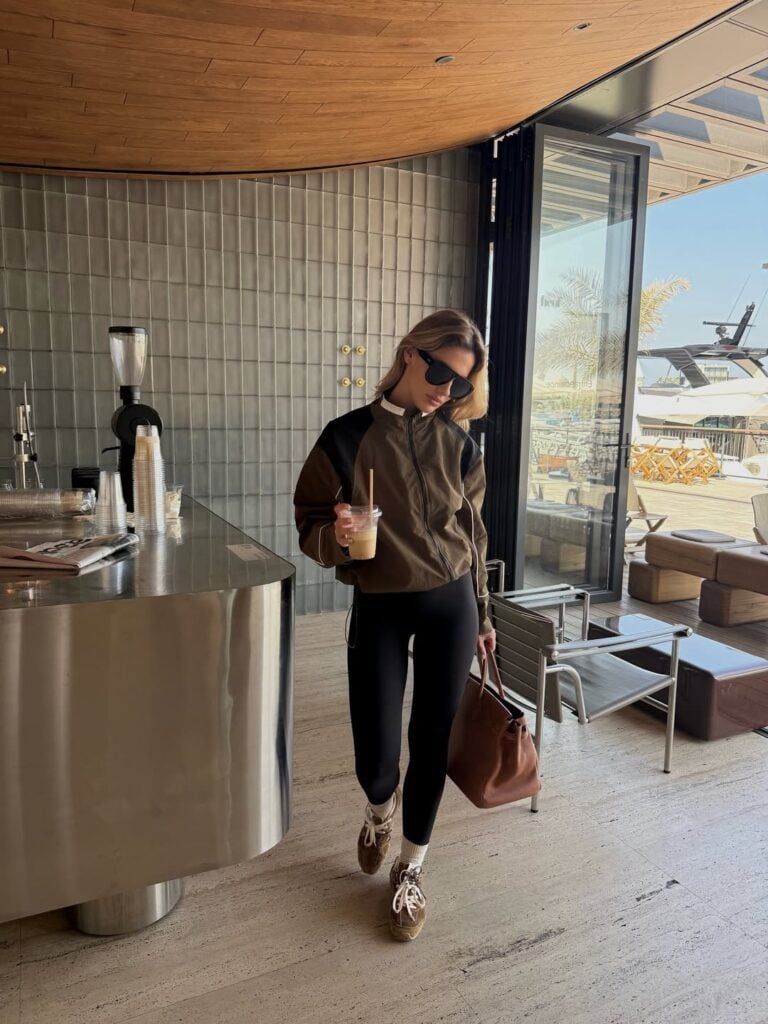A testament that even during Dubai’s winters, Tia proves you can always embrace an off-duty look with ease. She opted for a safari-green windbreaker for that effortless cool-girl edge, completing the outfit with a pair of New Balance suede sneakers, an Hermès Clemence Togo Birkin bagn and oversized shades.
