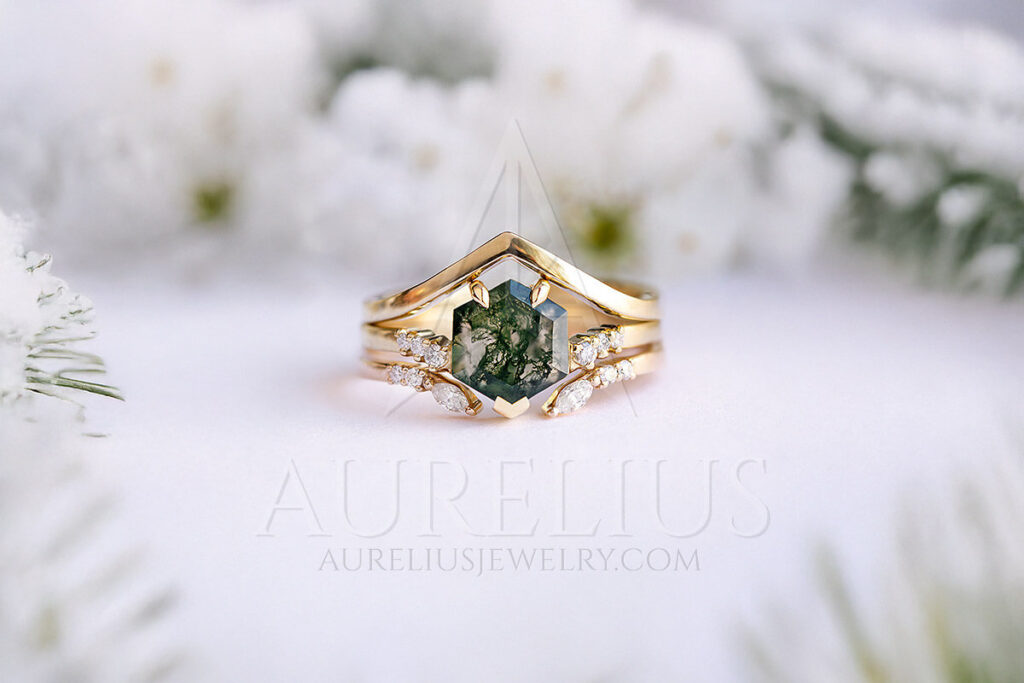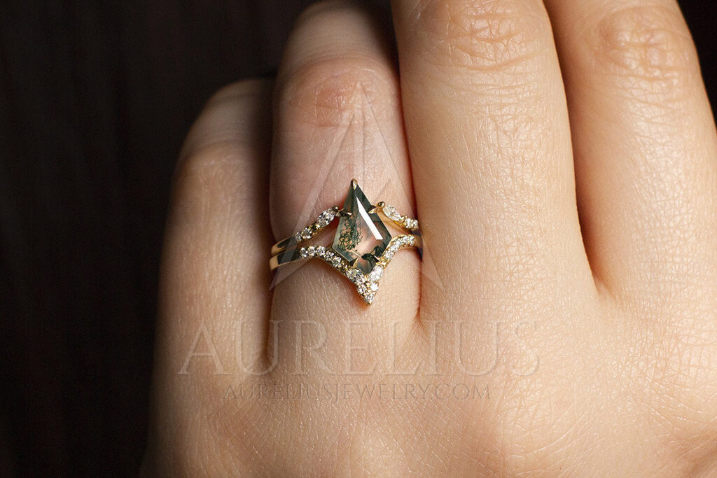 However, some wedding ring set designs just look more cohesive when worn with the wedding band on top. Imagine an elongated gemstone with diamond accents on the bottom part—it would naturally make more sense to balance out the design with a diamond wedding ring that would fit around the less busy part of the main stone. Take this ring with kite moss agate for main stone of the engagement ring and diamond around it in combination with an open wedding ring band featuring diamonds. It’s a gorgeous combo!