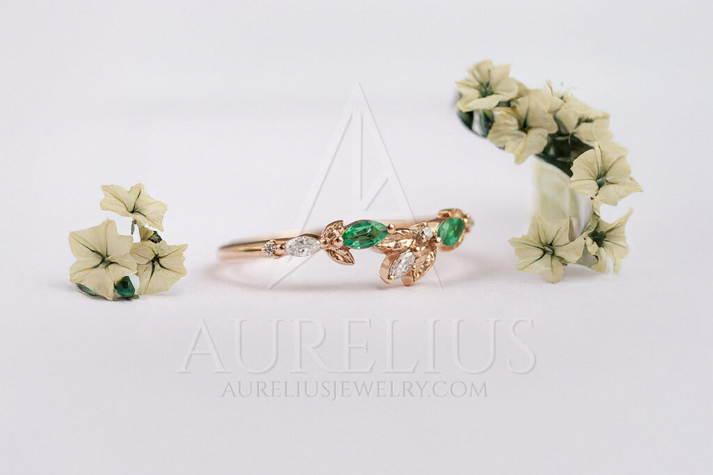Again, you can forego tradition and get a wedding band with unconventional elements like sculpted gold details and colored gemstones like this nature inspired ring that features leaf shapes and makes this emerald wedding ring, a dream ring for brides that love the nature.