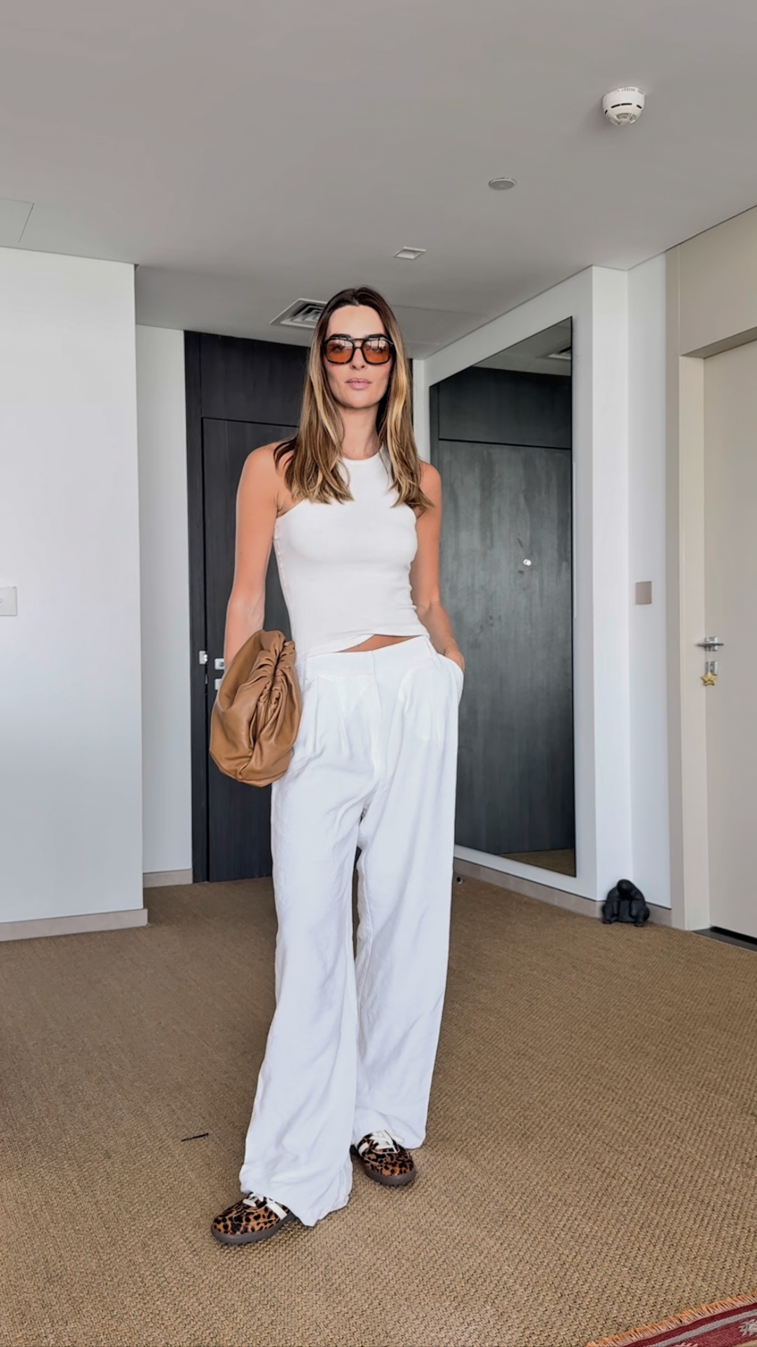 When it comes to colour pairing, you best believe Amelia will always deliver a masterclass. Even in its utmost simplicity, she elevated the white monochrome look with a white high-necked tank top and a pair of soft flowy cotton trousers. With a dash of a mocha mouse Bottega Veneta oversized leather pouch, undoubtedly matching the colour of the year, she further finished with a touch of brown tinted sunnies and a Louis Vuitton LV Sneakerina.