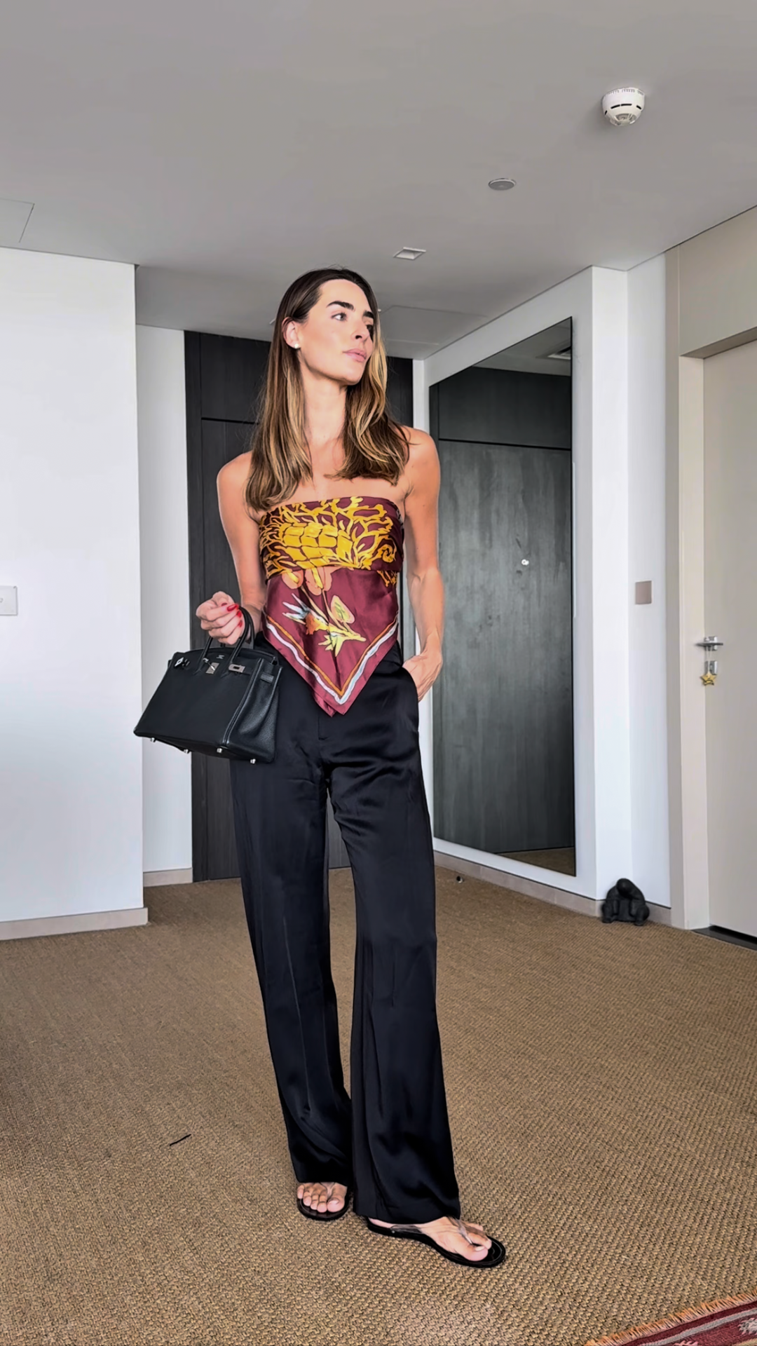 Perfecting the art of summer dressing, this time, Amelia opted to transform her silky floral-printed scarf into the summer’s favourite styling hack; a bandeau top. She added contrast to her brown and yellow-toned top with sleek satin wide-leg trousers in black and sandals, which she paired ever-so chicly with a Hermès black Birkin in Epsom leather.