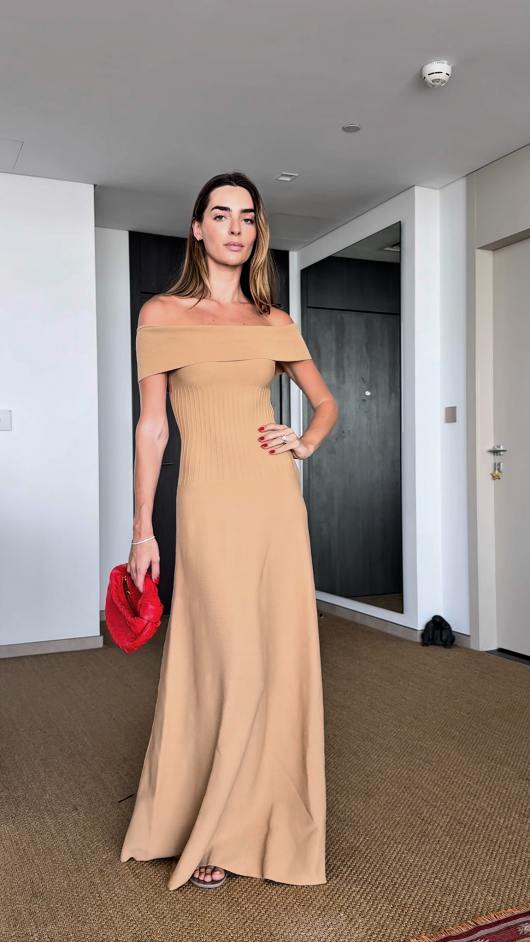 Keeping things simple yet surely elevated, the influencer wore a maxi beige dress by Staud. Showcasing an off-shoulder style, the dress featured a ribbed-knit waist design that flowed down for some flattering definition. Adding a pop of colour, she accessorised with a red mini Bottega Veneta Jodie bag and a set of dainty gold jewellery.