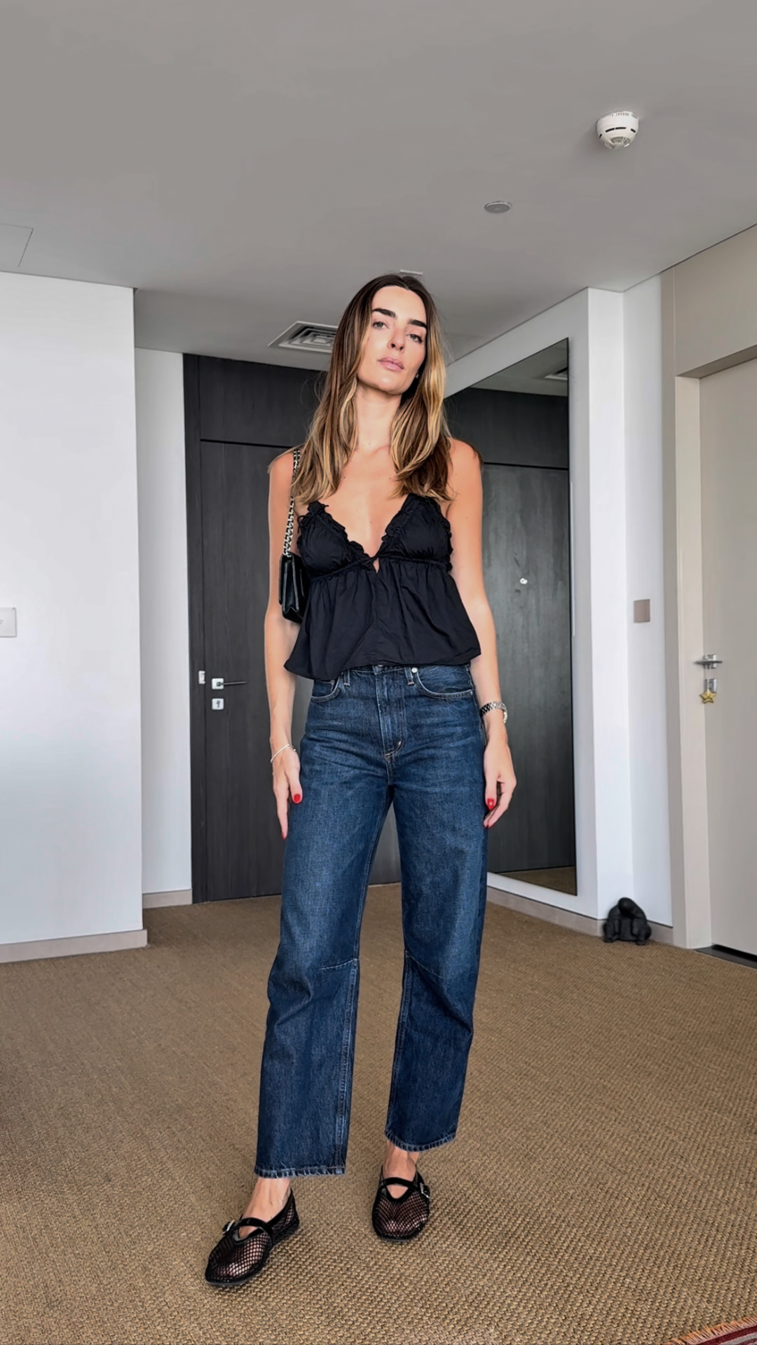 No one can deny the power of a flattering top and the perfect pair of ankle-length denim jeans. Versatile style that surely goes above and beyond, Amelia makes a strong case for casual chic, opting to wear a thin strapped babydoll top in black, high-waisted blue washed jeans, and the current cult-favourite accessory of the season, a pair of black mesh ballet flats. Topping it all off with a Chanel wallet which she reimagined into a shoulder bag. Stylish, as said.