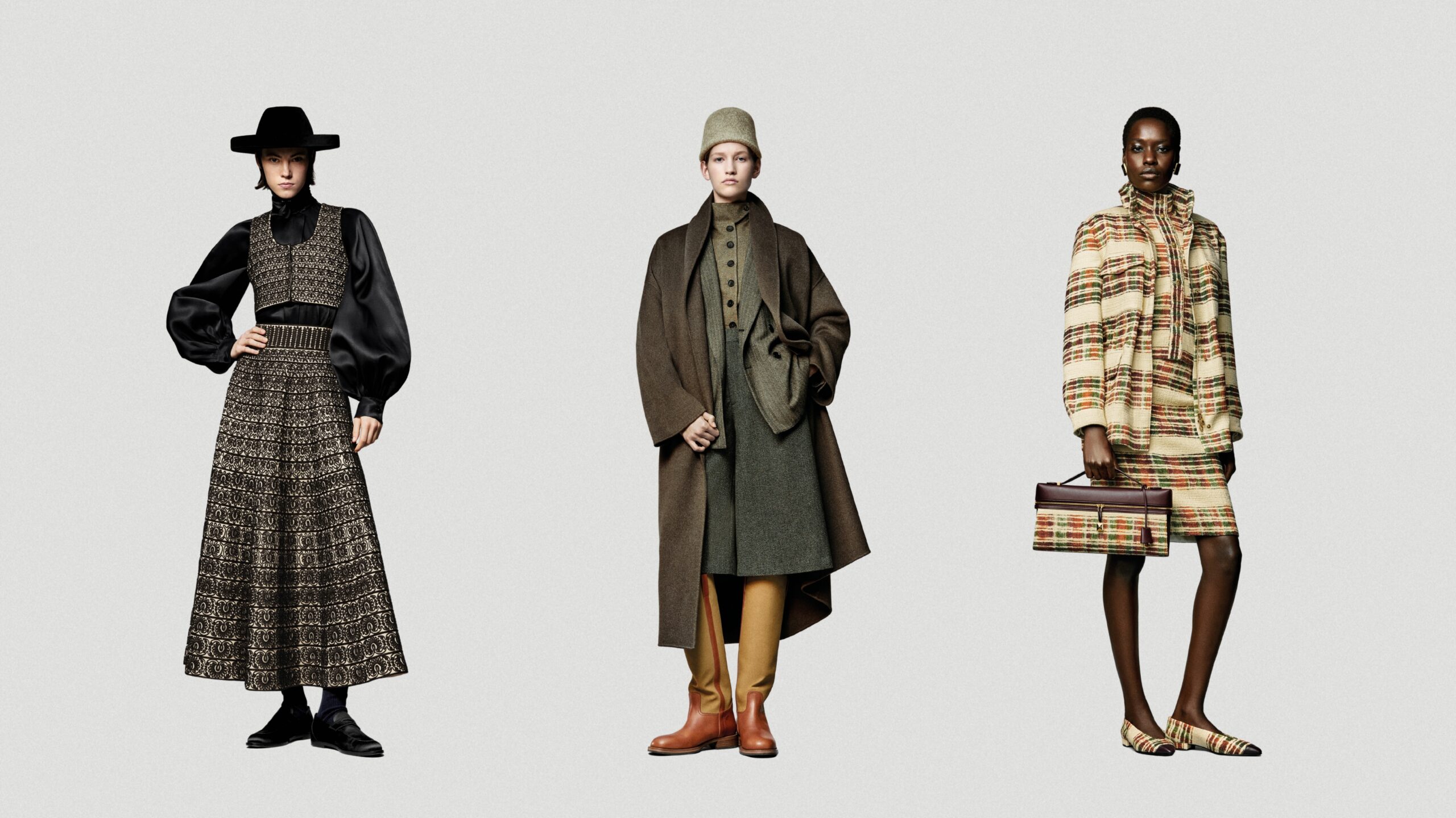 Voluminous layers in tonal hues – dark brandy, creamy vanilla, and deep oak – create an ombré effect that’s to die for, while Cartella Inglese patterns add a subtle complexity to the look. Bouclé fabrics and aquarelle tones nod to femininity, balanced by mannish tailoring and quilted jackets that echo the Scottish countryside.