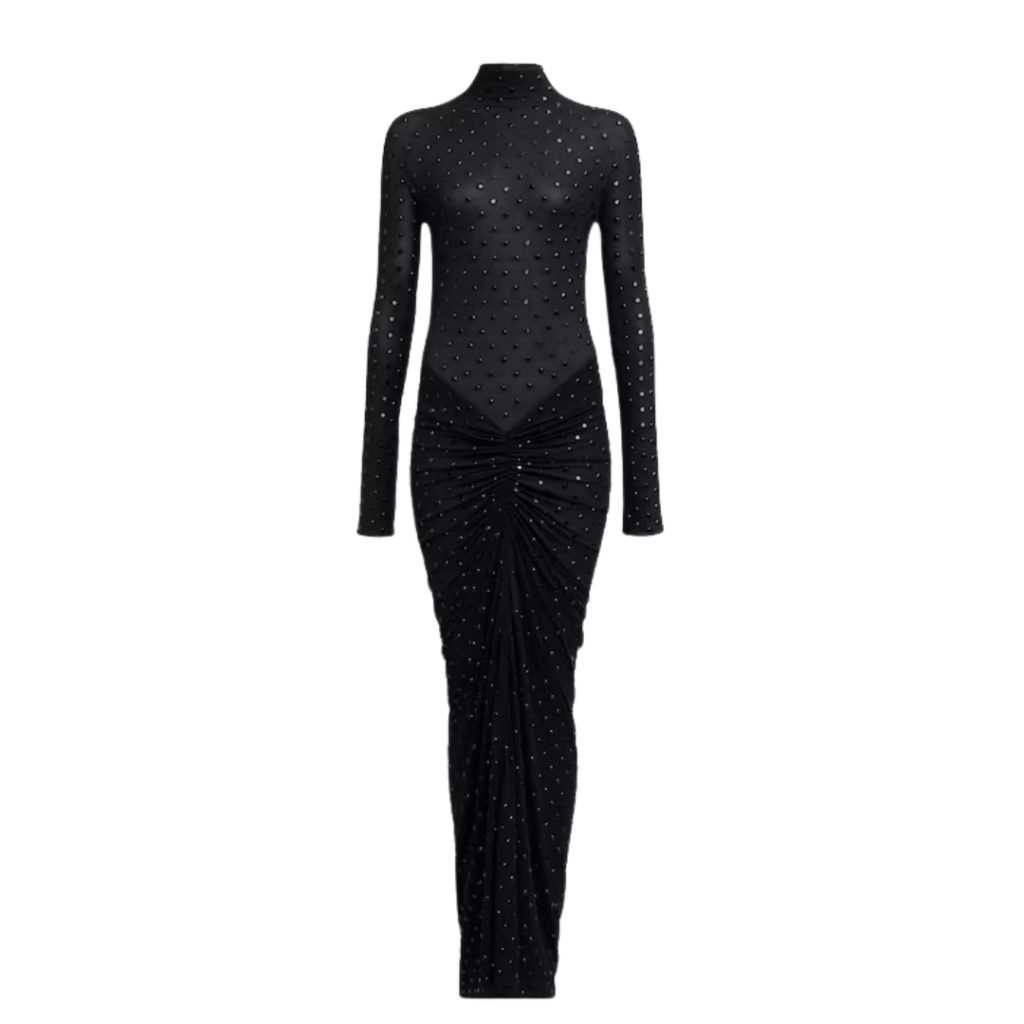 While staying true to her unapologetic approach to style, Rosie opted for a full monochrome look, choosing a Maison Alaïa high-neck draped dress with rhinestone detailing for the occasion.