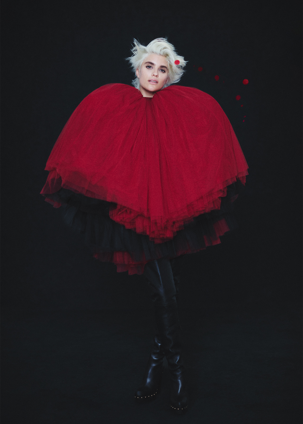 CRIMSON ECLIPSE DRESS IN TULLE, BOODY NOURELDIN AVAILABLE AT DESIGNERS&US. LOLA OVER THE KNEE BOOTS, CHLOÉ