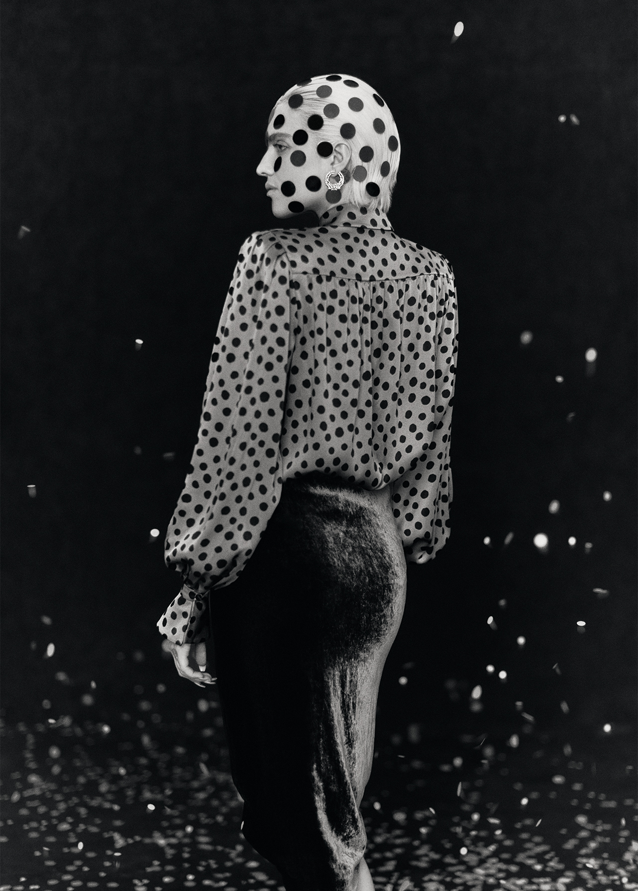 SKIRT IN VELVET, PLUS DE POIS DALMATA PRINT SHIRT IN CREPE SATIN, VALENTINO. PRINCESS CUT SPIRAL HOOP EARRINGS IN WHITE GOLD WITH DIAMONDS, SUZANNE KALAN