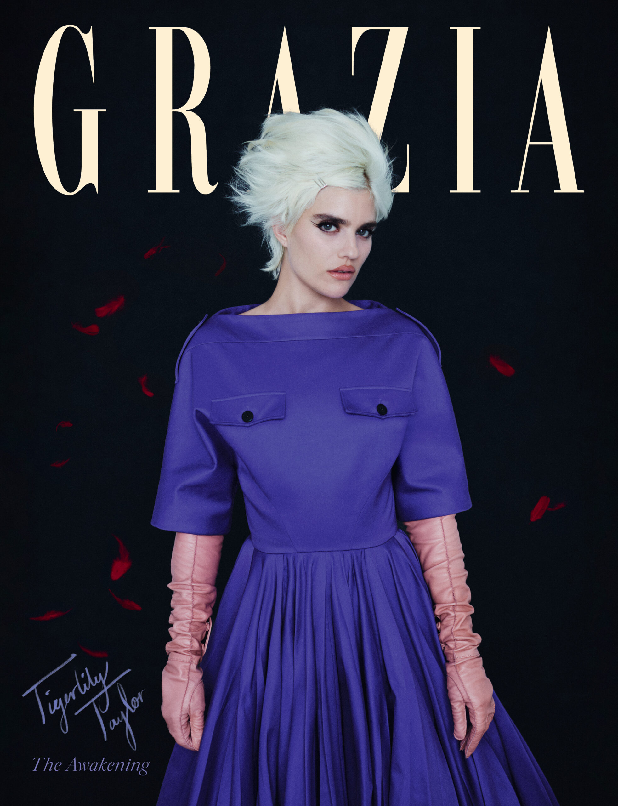 Tigerlily Taylor exudes an insouciant cool. Into the studio she strides, sporting her iconic razor-sharp pixie crop. We start shooting, her face card so photogenic it almost feels unfair. She moves with quiet confidence – radiating an effortless up-all-night style – every angle catching light, every look landing. It’s modern muse energy: London nonchalance with a flash of rock-royalty poise. We meet on set of her GRAZIA cover shoot and she welcomes me like an old friend.