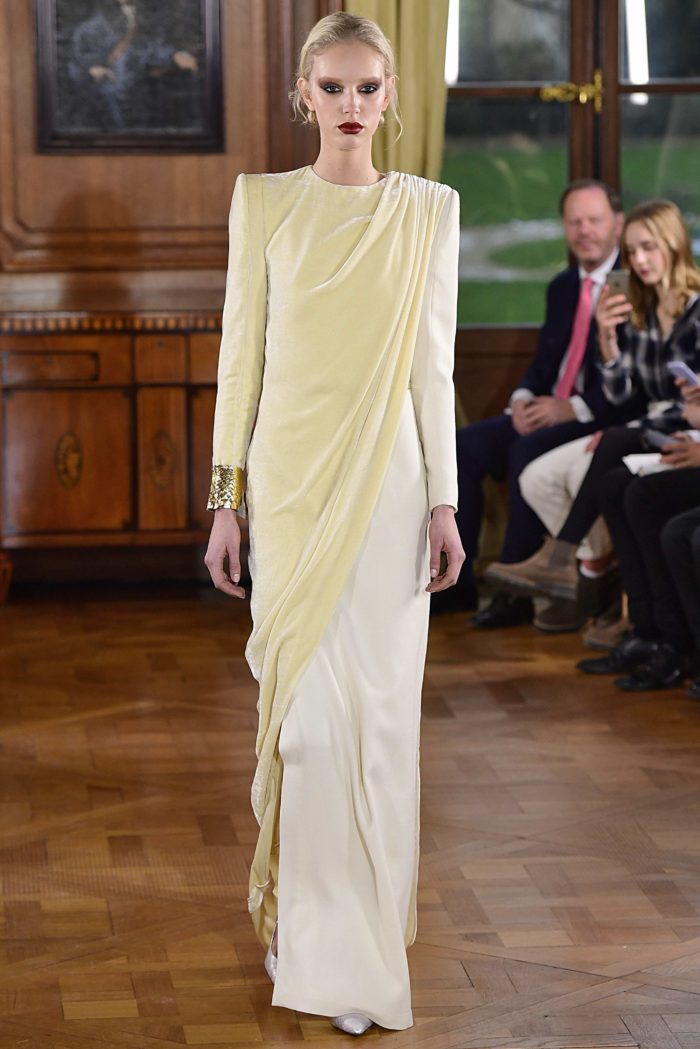 Creemos que el primer look de la pasarela de Ronald van der Kemp es perfecta para la mexicana. Con una capa de terciopelo en tono hueso que envuelve del pecho hacia abajo, la confección destaca por incluir un cinturón para acentuar la figura. Es discreto y favorecedor al mismo tiempo.