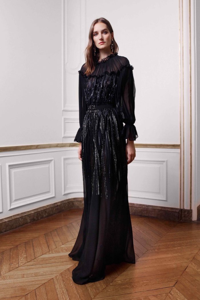 No todos los diseños con manga larga tienen que ser serios. Alberta Ferretti dicta lo contrario con este vestido que además incluye algunos destellos brillantes. Lo que más nos gusta es sin duda el contraste de texturas y la elegancia del azul marino.