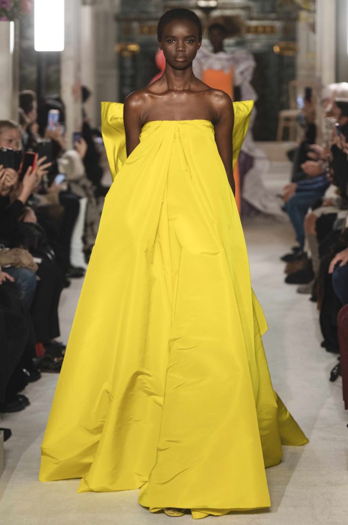 De la exquisita colección que Pierpaolo Piccioli presentó para Valentino esta temporada de Haute Couture, hay un diseño en específico —strapless con un gigantesco moño en la parte trasera en una tonalidad entre verdosa y amarillenta— que se caracteriza por ser simple pero a la vez impactante