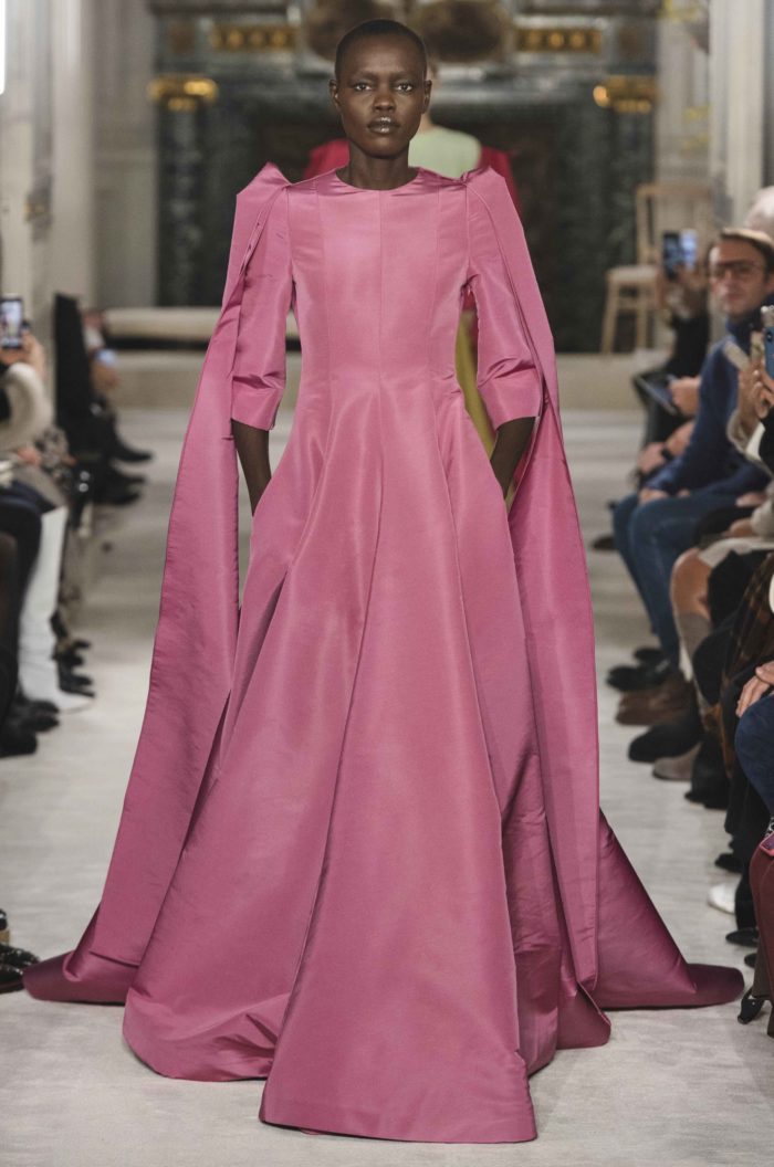 En rosa, obviamente. Este diseño de la misma colección de Valentino es ideal para robarse la alfombra roja por completo. No sabemos si es la opulencia de la parte baja lo que tanto nos encanta o los cortes que crean una silueta limpia. Y bueno, las mangas…