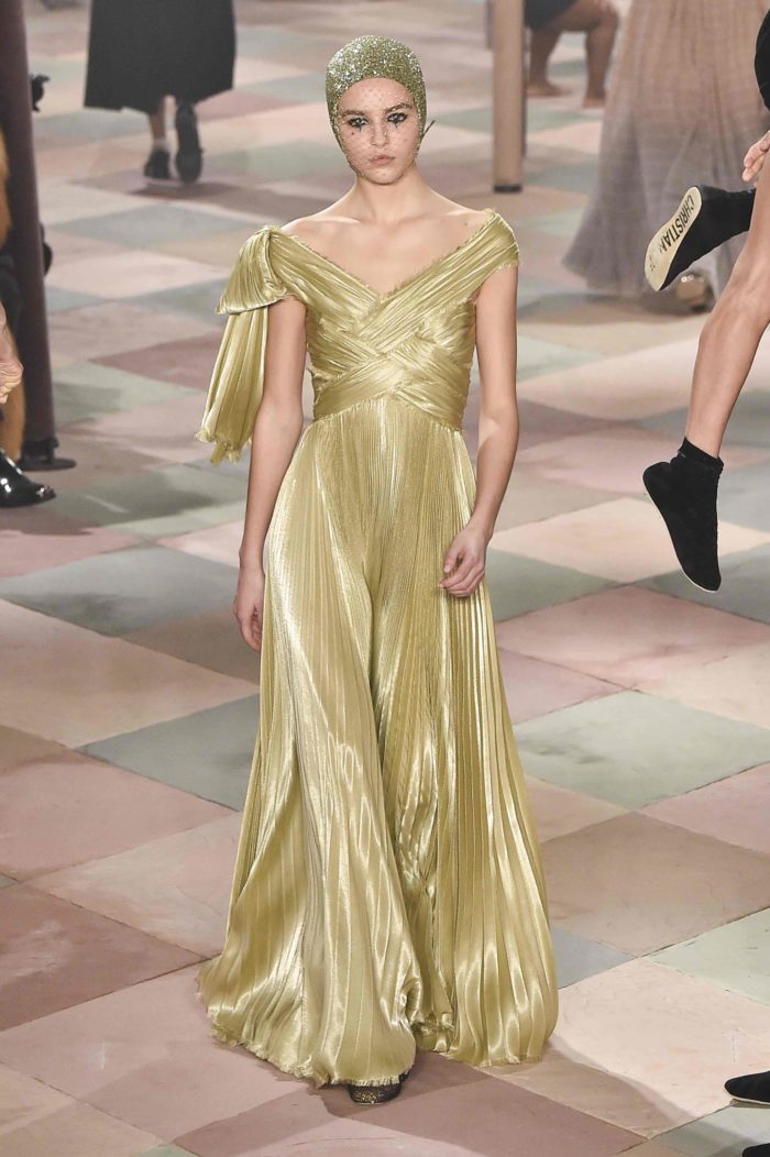 No hay nada más divertido y elegante a la vez que un vestido plisado como este de Maria Grazia Chiuri para Christian Dior. Y bueno, el color champagne es perfecto para impactar como una estrella y combinar con su estatuilla —aquí queremos verla recibir el Oscar—.