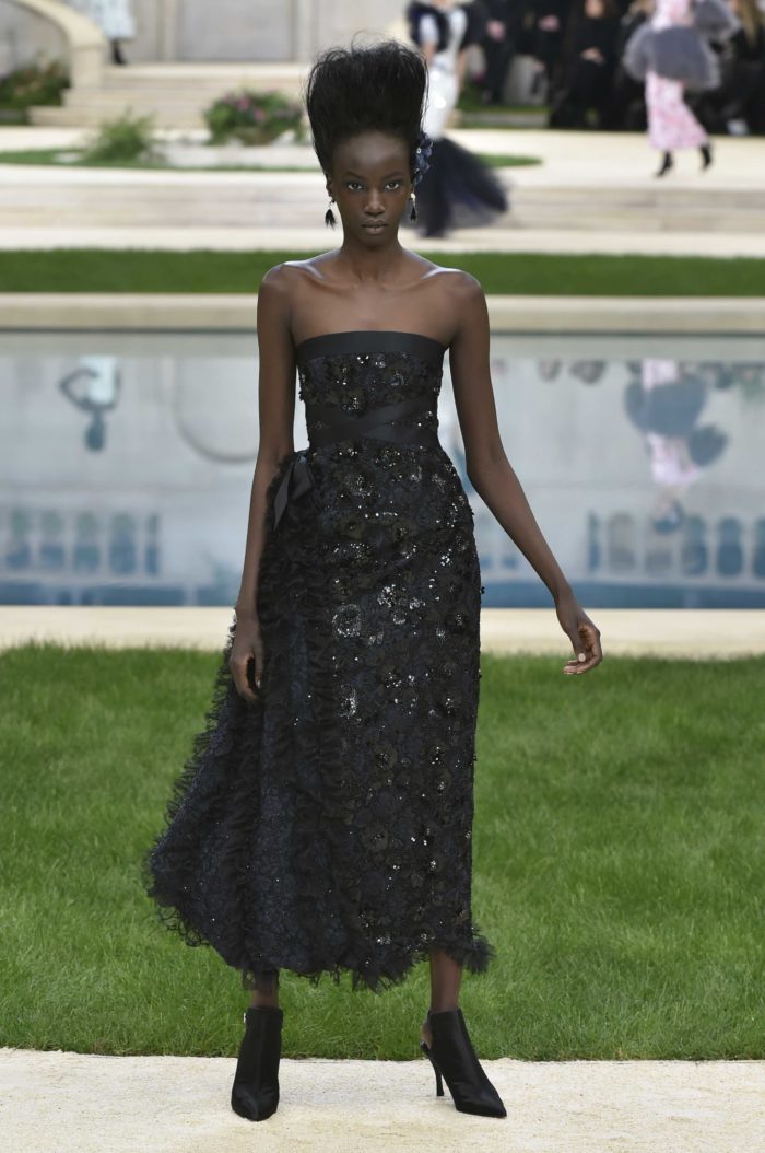 Lo que más nos gusta de este diseño de Karl Lagerfeld para Chanel es la combinación del azul marino con el negro. Este no solo la hará resaltar por las múltiples aplicaciones que forman las icónicas camelias, sino que también puede combinarse con un par de pumps impactantes.