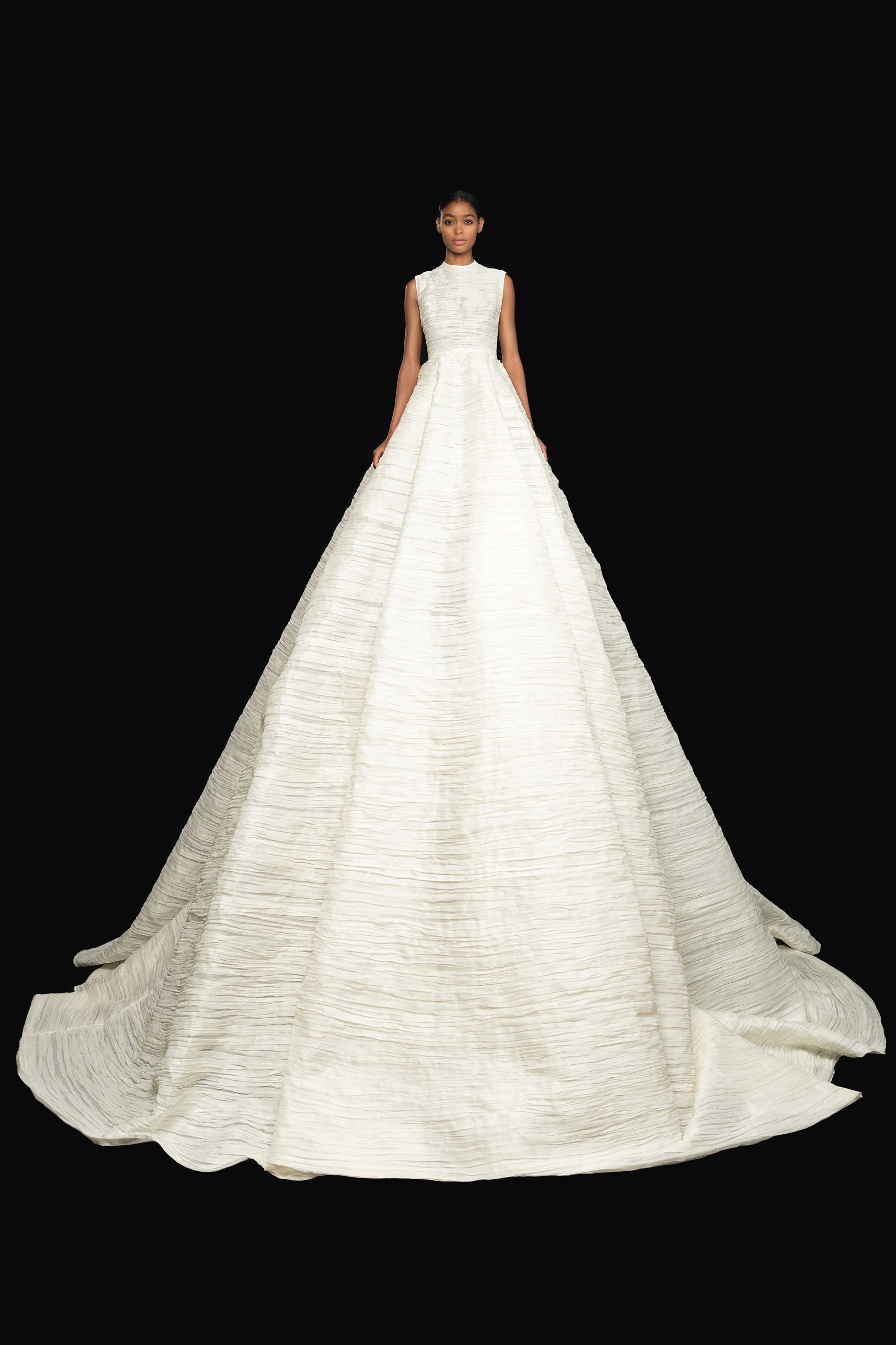 De esta silueta súper teatral y que nos recuerda a una medusa, amamos la tela fluida y el plisado manual.