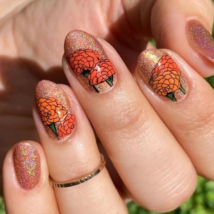 Otra propuesta consiste en una manicura con flores de cempasúchil. Los tonos naranjas, amarillos y dorados dominan el diseño, evocando el símbolo principal de los altares. Las flores pueden pintarse sobre una base neutra o negra para resaltar su forma, o bien emplear aplicaciones mínimas de esmalte en relieve que aporten textura sin sobrecargar el conjunto.