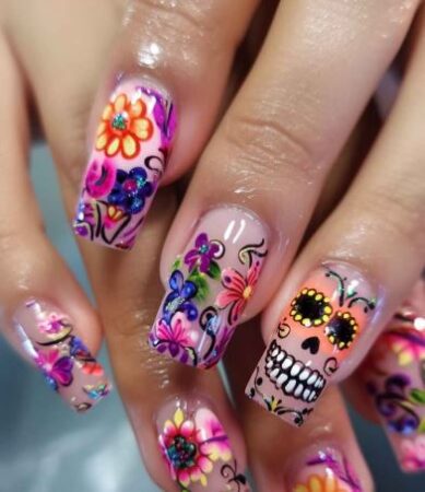 Las uñas con detalles de papel picado también se han vuelto una elección popular. Este diseño juega con patrones geométricos y líneas recortadas que recuerdan al tradicional adorno de las ofrendas. Se puede lograr con una base clara y dibujos en colores contrastantes, como morado o azul, representando los tonos típicos de las festividades.