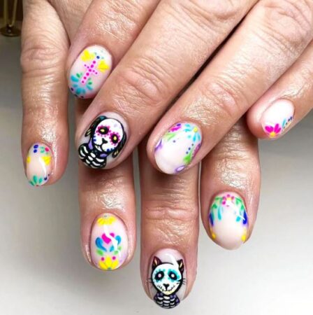 Una de las opciones más representativas son las calaveras decoradas. Inspiradas en la estética del arte popular mexicano, pueden realizarse con base blanca y trazos finos en negro para delinear los rostros, o bien con pequeños acentos en tonos naranja y fucsia que recuerdan las flores y los adornos tradicionales.