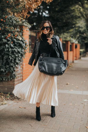 Para un enfoque más urbano, la falda de piel puede combinarse con una chaqueta de inspiración utilitaria y botas de combate. Esta fórmula explora el contraste entre la elegancia de la falda y la actitud más ruda de las prendas utilitarias. La chaqueta puede llevarse abierta para mostrar la estructura de la falda o cerrada para aportar volumen adicional en la parte superior. Las botas de combate, por su parte, anclan el look en una estética deliberadamente moderna.