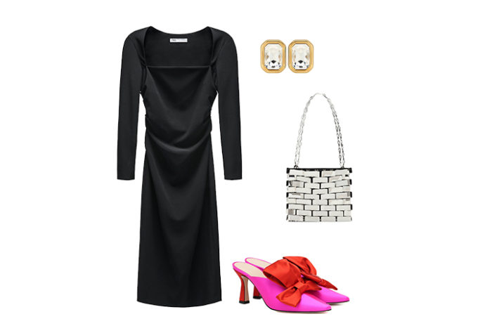 Vestido, Zara; Aretes, Balenciaga en Mytheresa; Mules, Wandler en Mytheresa; Bolso, Paco Rabanne en Mytheresa