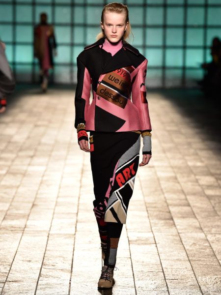 Finalmente, Mary Katrantzou presentó en el London Fashion Week AW18 una colección inspirada en pósters de la escuela diseñados por artistas como Joost Schmidt, Oskar Schlemmer y Kandinsky.