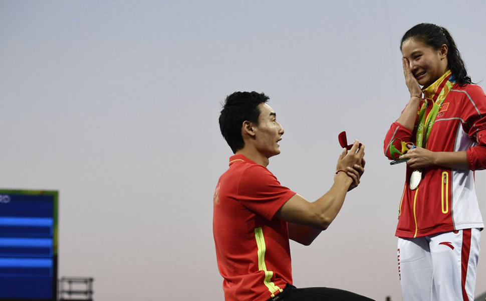 Los clavadistas de la delegación China, Qin Kai y He Zi, se comprometieron el día de ayer. Mientras la segunda estaba en el podio preparada para recibir su medalla de plata, su novio sacó la cajita que muchas esperan y le dio el sí.