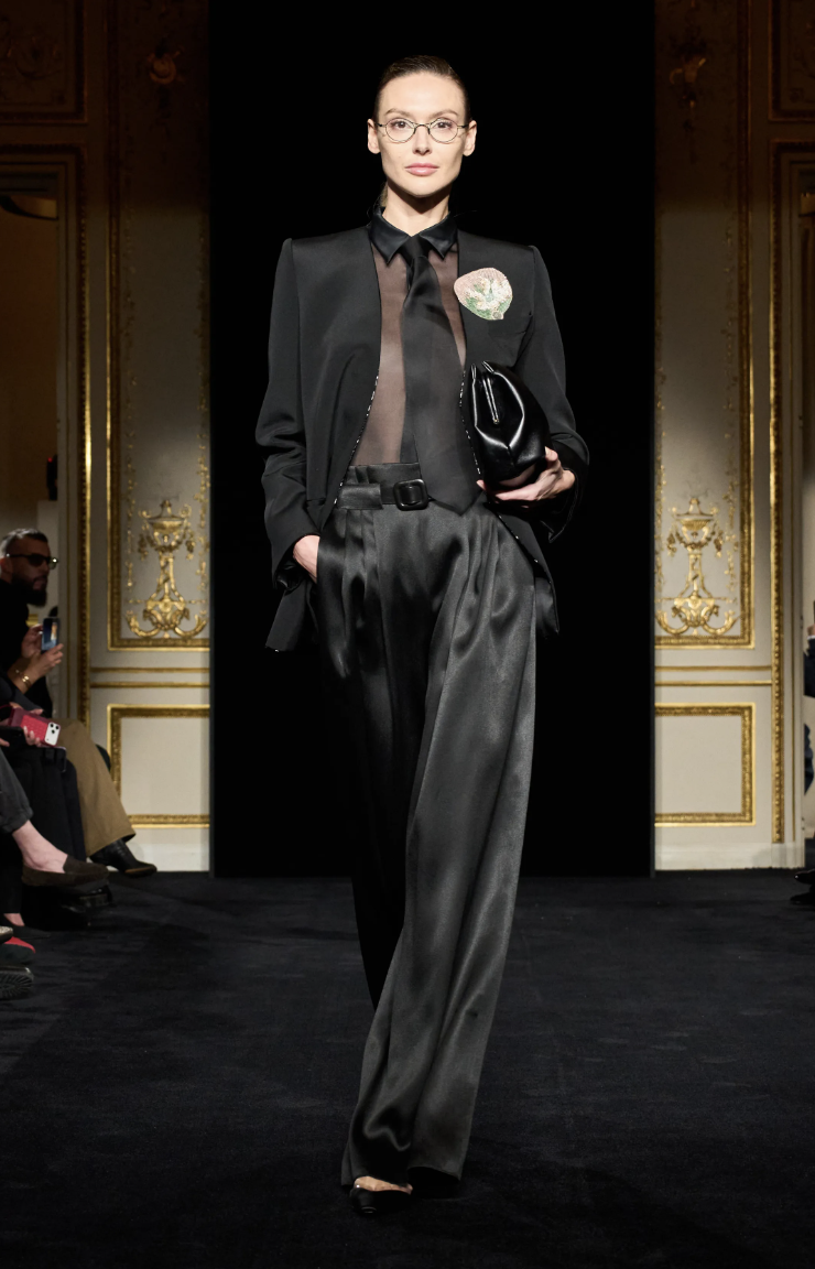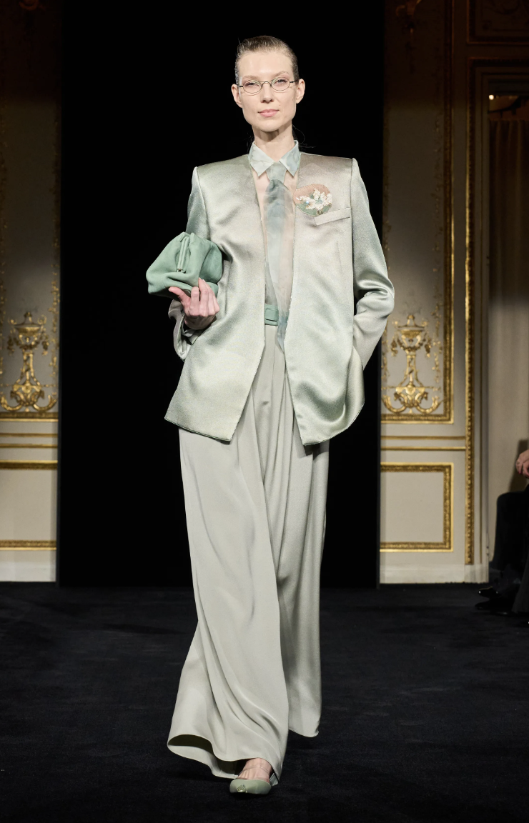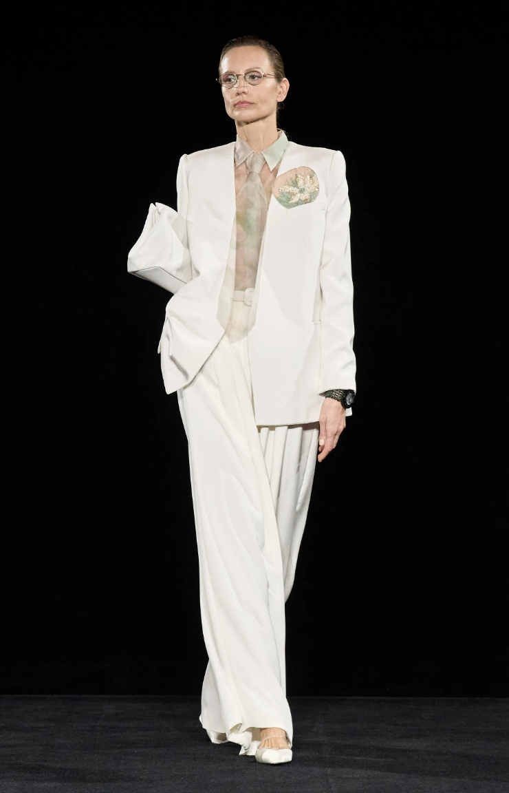 Las siluetas apostaron por un equilibrio delicado entre lo masculino y lo femenino. El tailoring se suavizó sin ser confrontado, con trajes de líneas relajadas, blazers fluidos y pantalones amplios que acompañan el movimiento del cuerpo. Las camisas de organza transparente, combinadas con corbatas etéreas, introdujeron una sensualidad contenida, más sugerente que explícita. Todo se sintió limpio, editado, esencial.