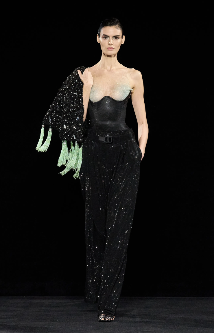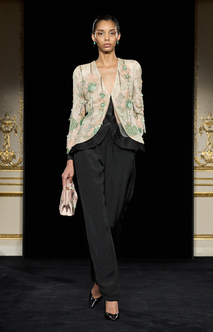 Uno de los gestos más reveladores fue la ausencia casi total de accesorios. Sin sombreros, a pesar de su peso histórico dentro del universo Armani, Silvana dejó claro su punto de vista: menos artificio, más presencia. La decoración se limitó al bordado, utilizado con precisión y discreción, reforzando la idea de una costura que no necesita excesos para afirmar su valor.