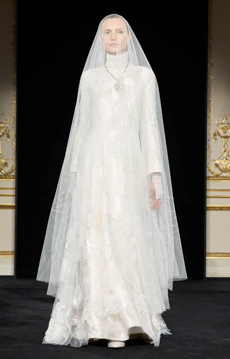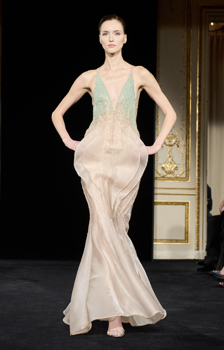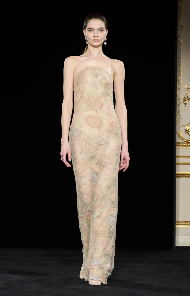 Lejos del espectáculo, la colección se construyó desde una elegancia silenciosa, femenina y profundamente consciente. Desarrollada junto al equipo del atelier, la propuesta respiró ligereza, fluidez y una serenidad poco habitual en un contexto que suele privilegiar el impacto inmediato. Aquí, la alta costura no se presenta como objeto de contemplación distante, sino como una experiencia cercana, pensada para ser habitada.