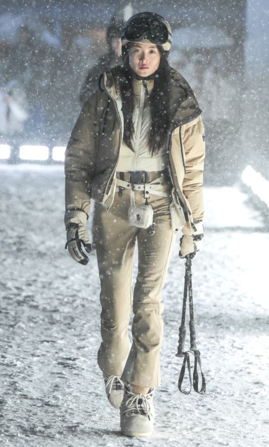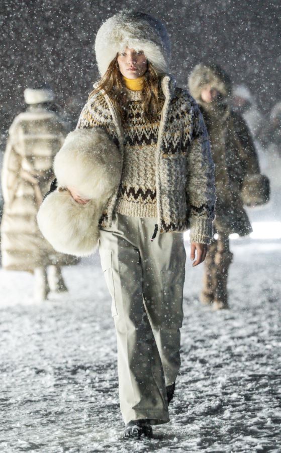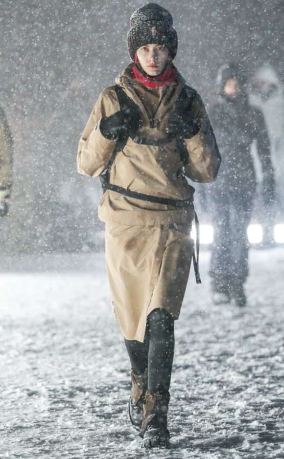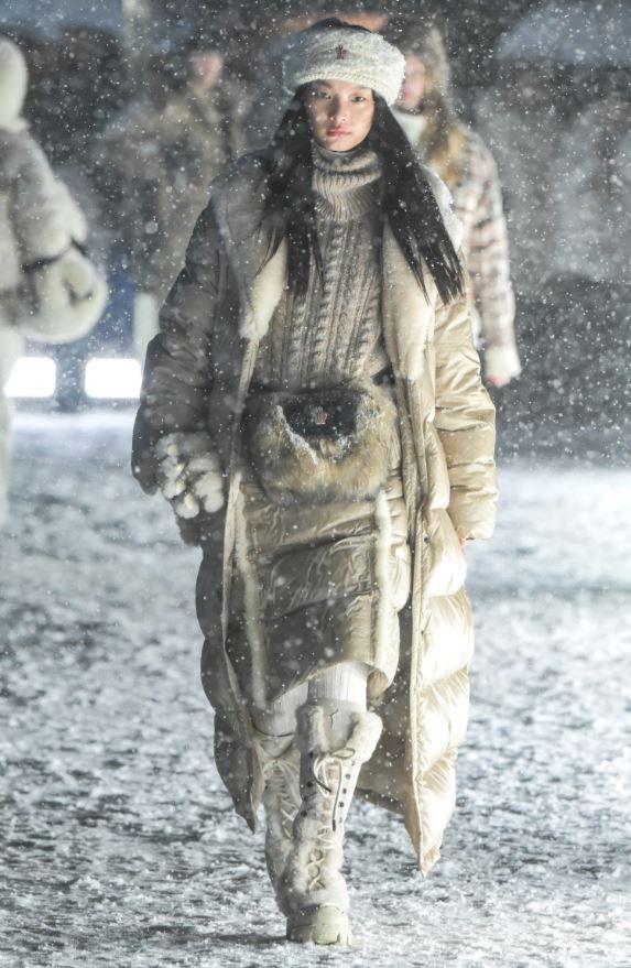 En este desfile, Moncler Grenoble presentó una colección innovadora, consolidando la tendencia del lujo funcional en la moda de alta montaña, incluso bajo las condiciones climáticas más extremas.