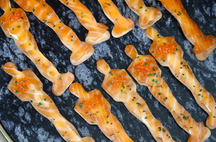 Puck y su equipo en Wolfgang Puck Catering, guiados por Eric Klein, vicepresidente culinario, son conscientes de que tienen que ofrecer nuevos platos, así como una variedad de opciones veganas y vegetarianas. “Tenemos cinco tipos de pasta, desde agnolotti hasta pasta con trufas, pizzas veganas, berenjena de Hunan con especias chinas sobre arroz y una versión vegetariana de la ensalada de cangrejo con arroz crujiente del restaurante Merois de West Hollywood”, explica. En lugar de cangrejo, se sustituye por tofu y se cubre con una vinagreta de lima y miel.