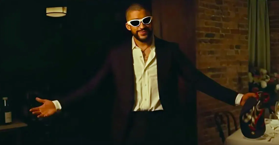 Luego, Bad Bunny aparece con un traje negro, lentes de sol blancos, y una gorra y un pañuelo en su mano, además de dejar ver su cabeza recién afeitada.