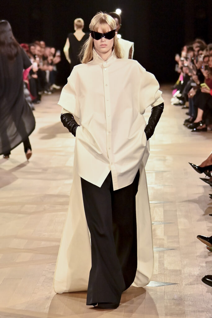 Piccioli plantea una Balenciaga donde la ropa no domina al cuerpo, sino que dialoga con él. La silueta se suaviza, se adapta y acompaña. Prendas tradicionalmente asociadas al confort como leggings, sudaderas o piezas de inspiración deportiva se integran con gestos de refinamiento clásico.
