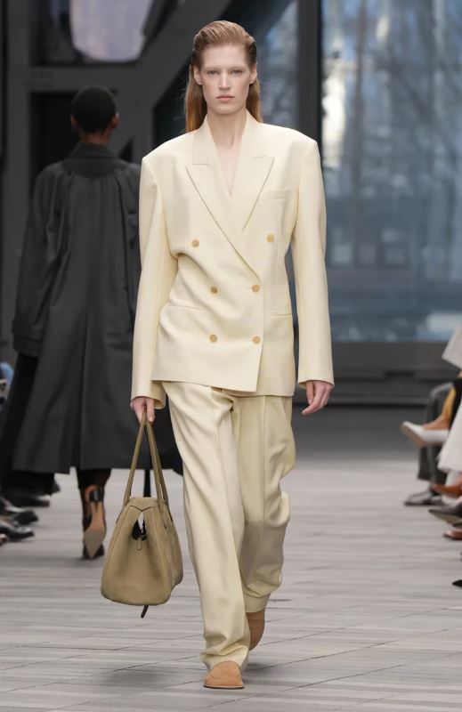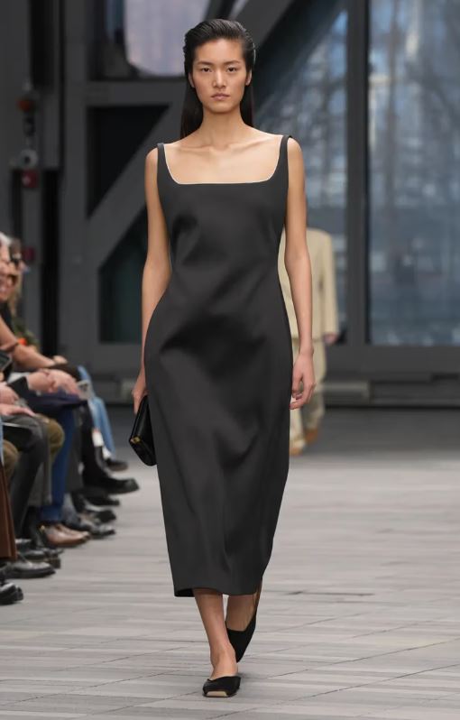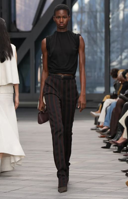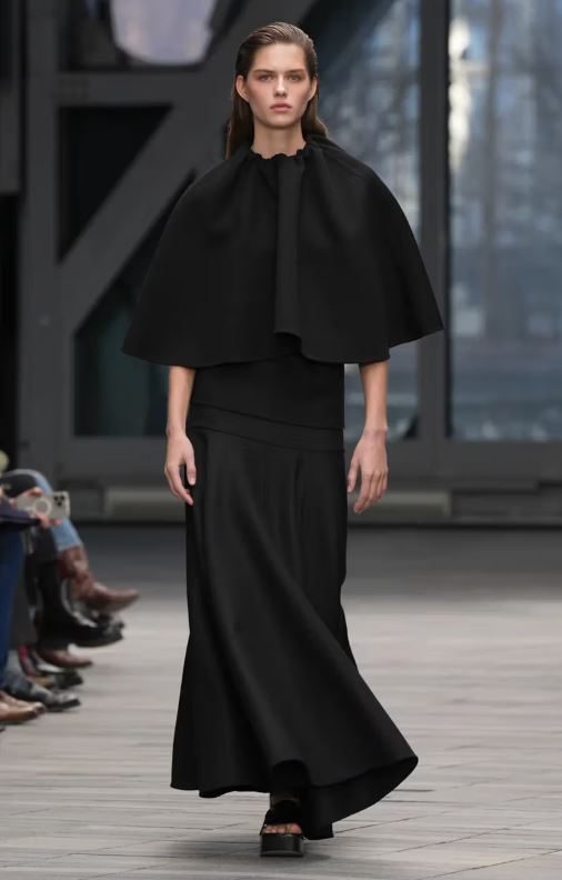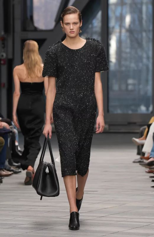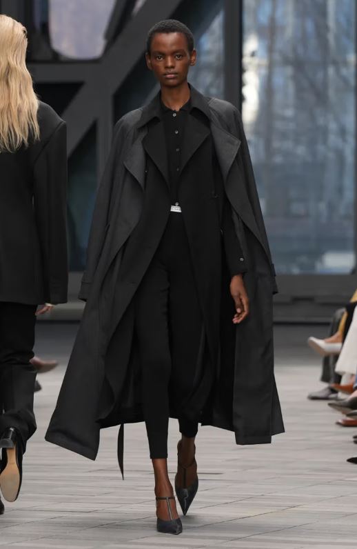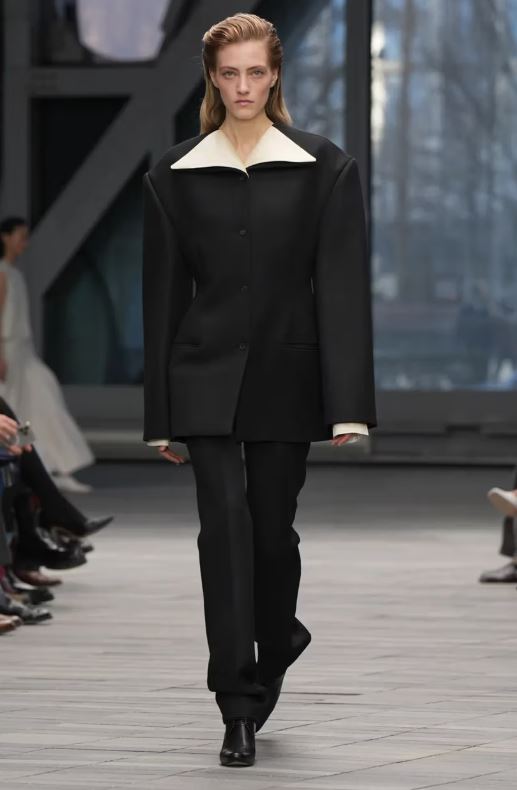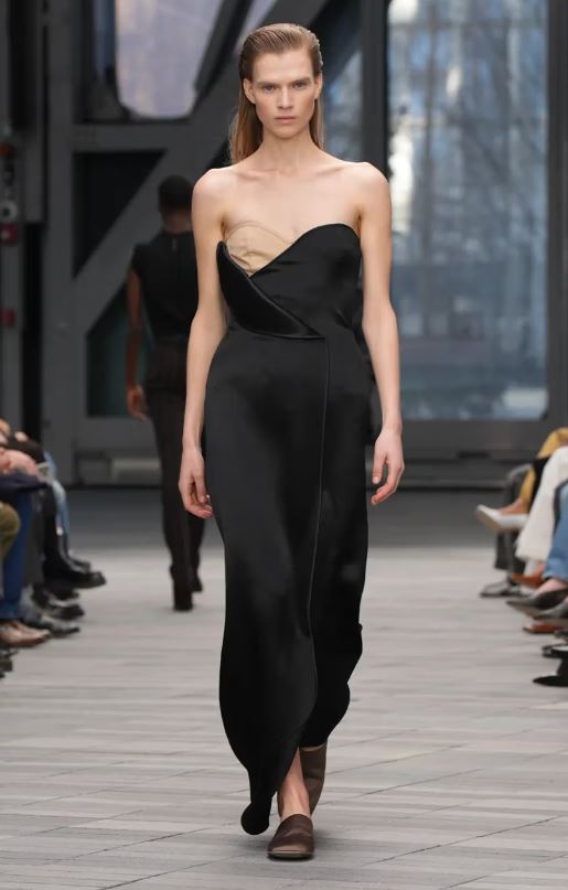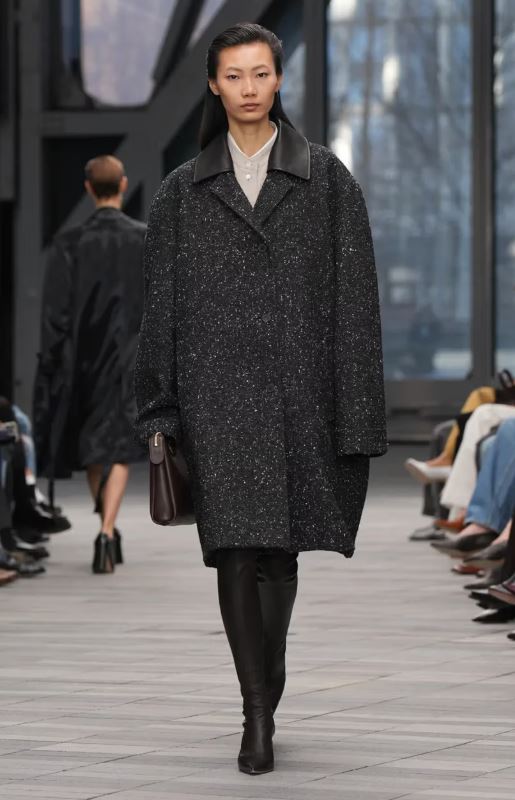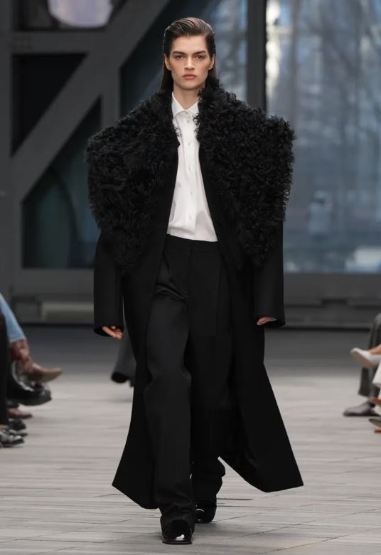 La inauguración del desfile estuvo protagonizada por looks en blanco y negro con detalles minimalistas y simplificados: un traje negro austero con raya diplomática tonal lucía solapas encogidas, y un vestido negro sin tirantes y estructurado parecía casi sin costuras. Después, abrigos de lana moteada, trajes monocromáticos de cuero y cuellos de borrego y cuero intensificaron el ambiente de indulgencia.