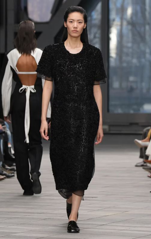 Los recortes dejaban al descubierto la parte trasera de las chaquetas de mujer, mientras que los blazers ajustados y sin mangas de hombre resaltaban las mangas. Se aplicaron telas de sastrería a vestidos sencillos pero arquitectónicos, que contrastaban con piezas ricamente drapeadas compuestas por telas flexibles. Destacaron las chaquetas translúcidas en rojo ahumado y gris topo, que evocaban el modernismo descarnado de la época de Raf Simons.