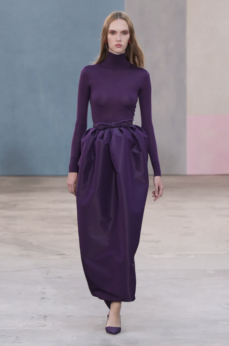 Un ejercicio de contraste entre lo ajustado y lo voluminoso. El conjunto se compone de un jersey de cuello cisne en un tono púrpura profundo, cuya textura fina se ciñe al cuerpo.