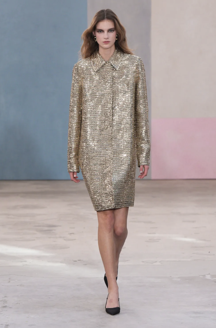 La opulencia se manifiesta en este vestido-abrigo de corte recto y líneas minimalistas. Confeccionado en un tejido metálico de color dorado pálido con una trama que simula un tejido de malla o micro-lentejuelas, la prenda destaca por su brillo uniforme y estructurado.