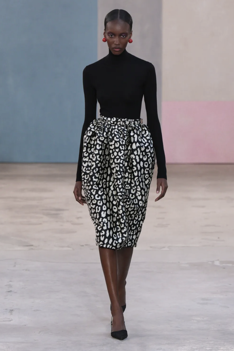 La falda presenta un estampado de leopardo estilizado en blanco y negro de gran escala y una estructura abullonada que crea volumen en las caderas antes de estrecharse hacia la rodilla. Los pendientes de bola en color rojo intenso actúan como el único punto focal de color, rompiendo la dualidad del blanco y negro con una nota de energía.