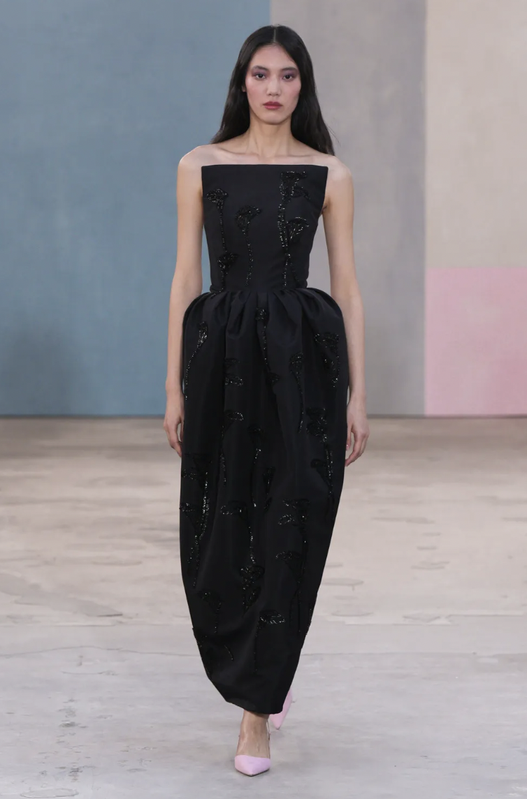 Este vestido largo sin mangas en negro azabache destaca por su escote palabra de honor extremadamente recto y geométrico. El cuerpo es ajustado hasta la cintura, donde se abre ligeramente en una falda larga con volumen controlado.