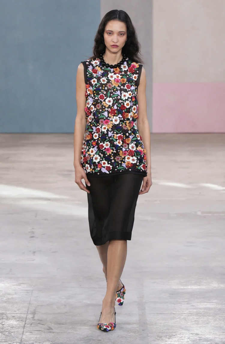 El último look cierra con una nota romántica y artesanal. Se presenta una túnica sin mangas cubierta totalmente por un bordado floral multicolor sobre fondo negro, con flores de distintos tamaños en tonos rojos, amarillos y blancos que evocan un jardín denso.