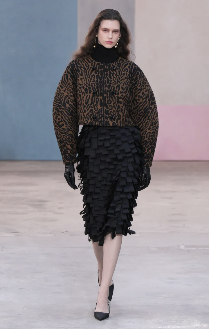 El primer conjunto presenta un audaz juego de proporciones. La parte superior consiste en una chaqueta corta de doble botonadura con un marcado estampado de leopardo en tonos ocre y chocolate; su construcción destaca por unas mangas exageradamente redondeadas y voluminosas que crean una silueta circular.