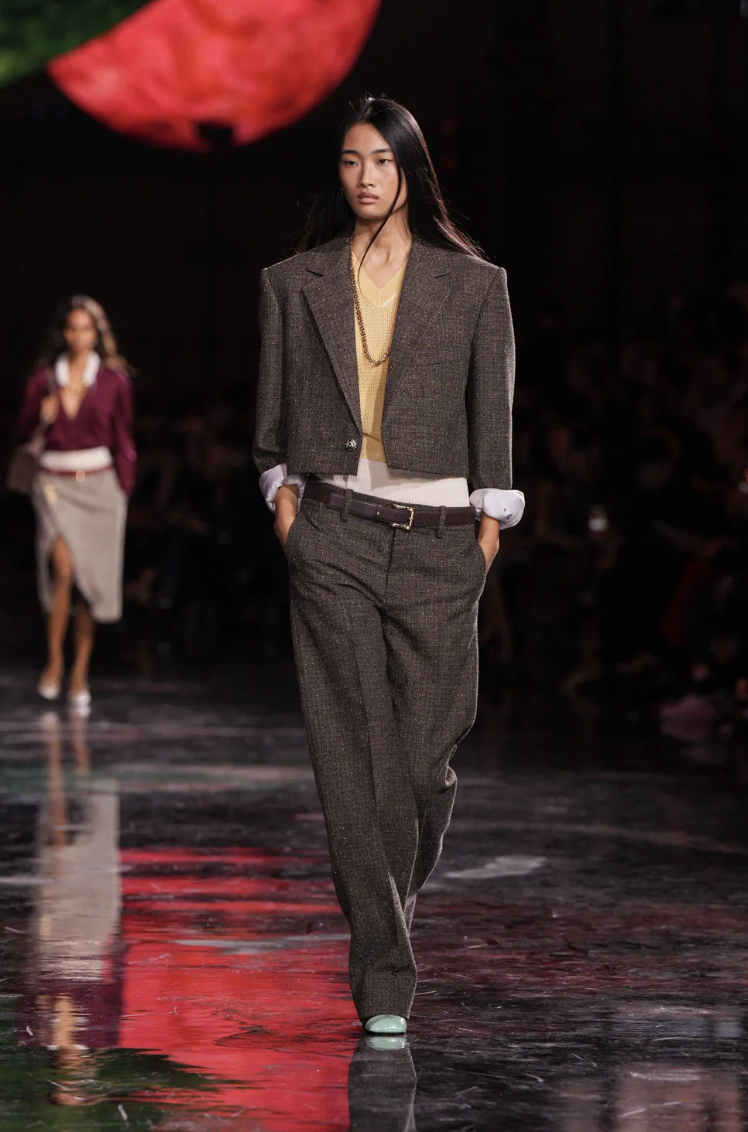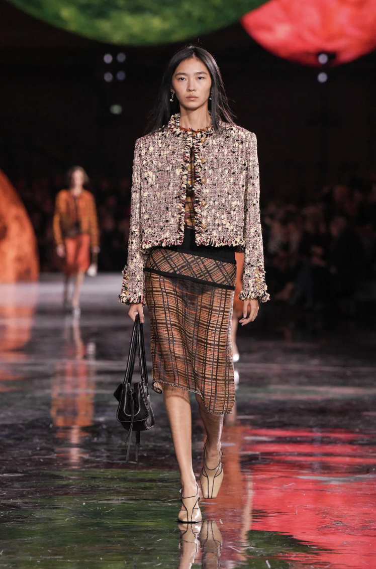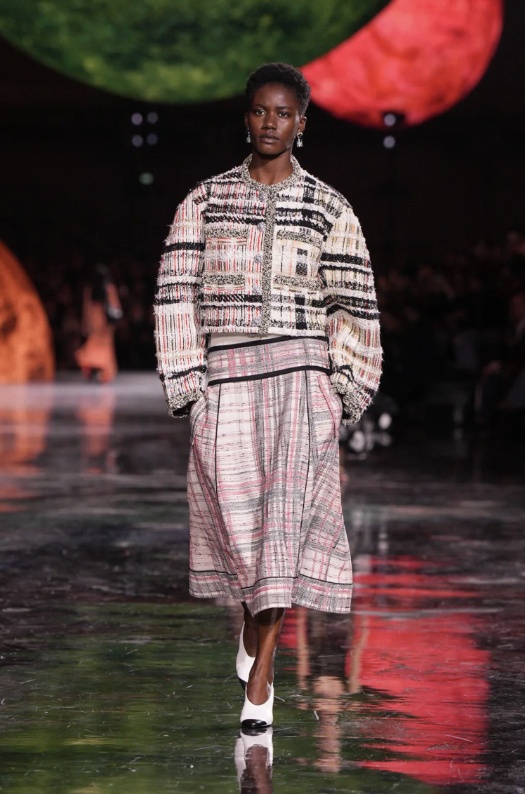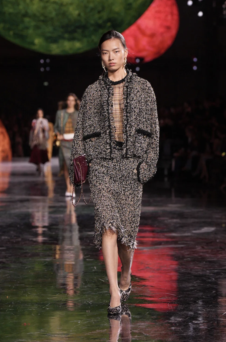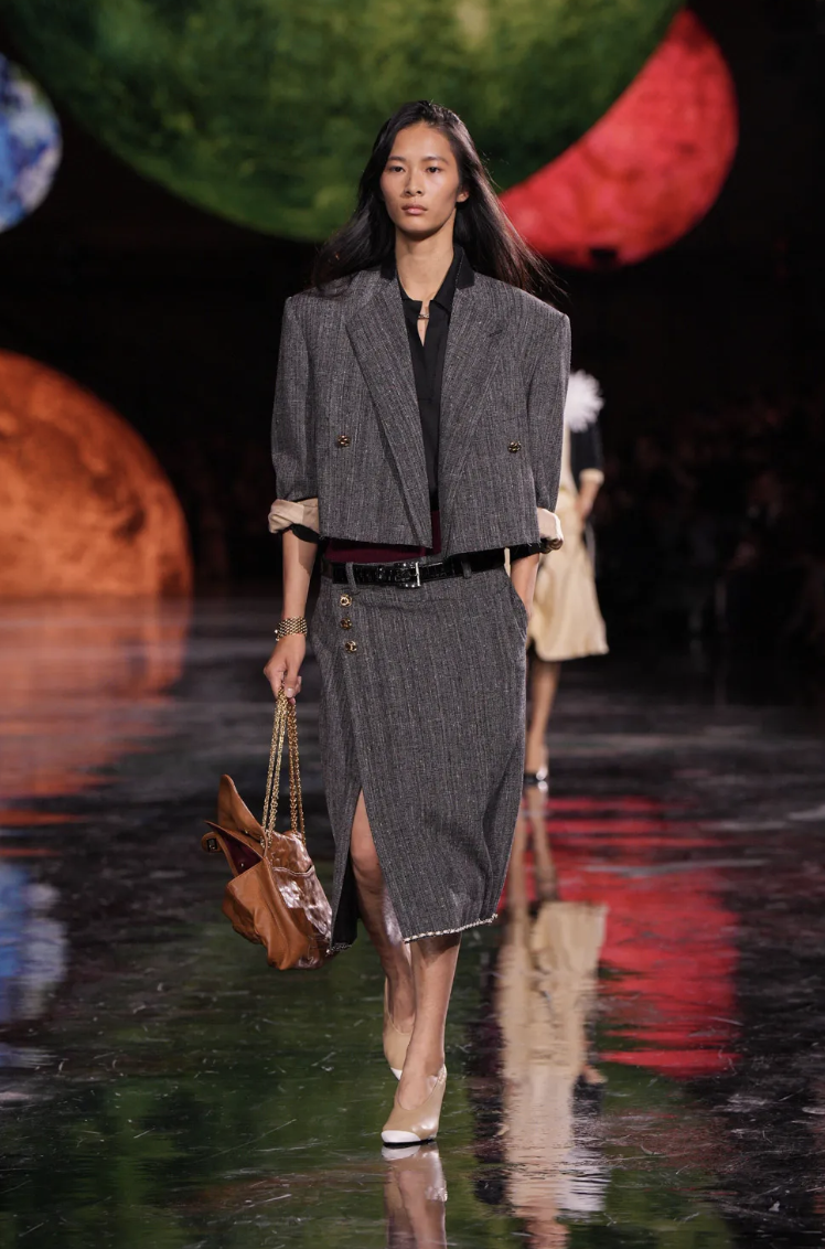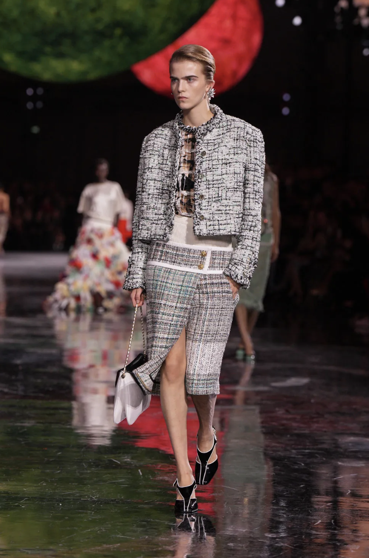 Las siluetas en esta colección mantienen la elegancia clásica de CHANEL, pero con un enfoque contemporáneo. Blazy ha jugado con formas amplias y relajadas, equilibrando la estructura con la fluidez.
