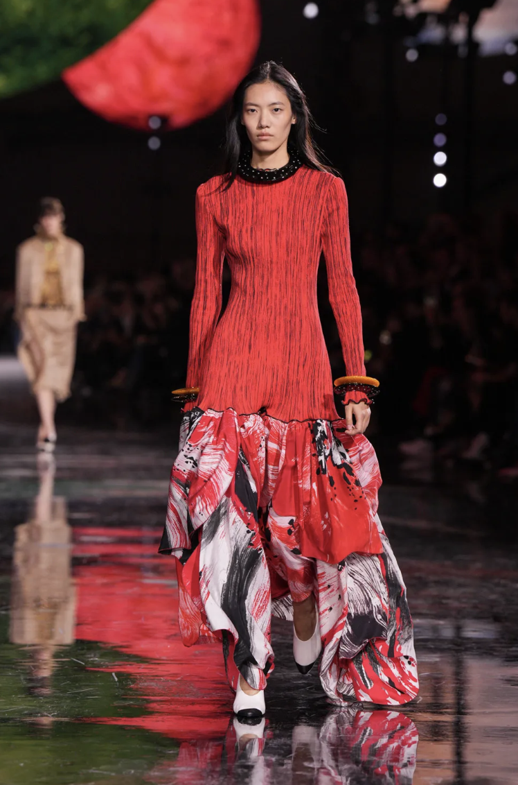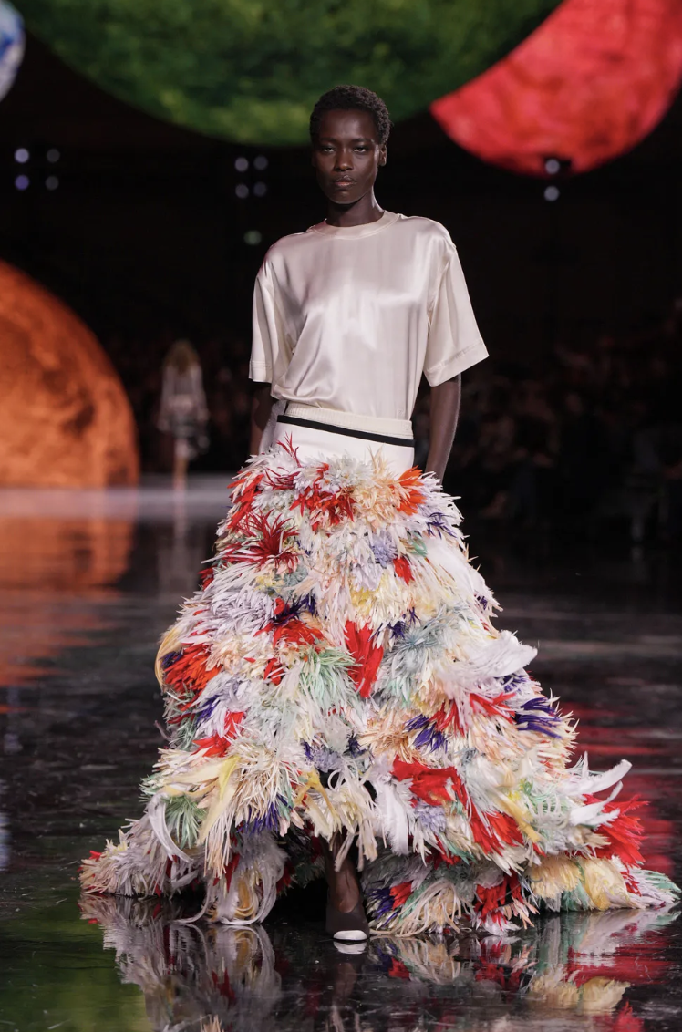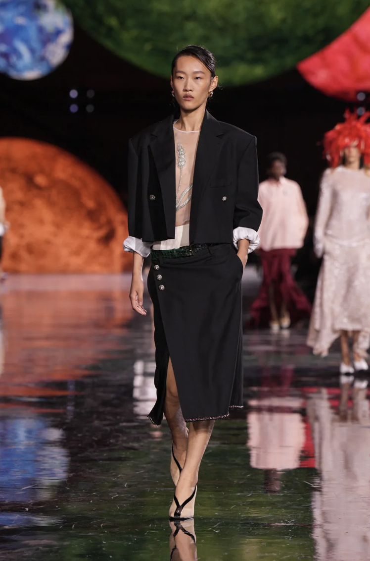 En cuanto a la paleta de colores, el desfile estuvo marcado por una mezcla de tonos de plata, dorado y azul profundo, combinados con matices cálidos de rojos, naranjas y fucsias, evocando la fuerza y la energía cósmica. Los colores vibrantes se mezclan con el brillo metálico, creando una atmósfera de lujo celestial.
