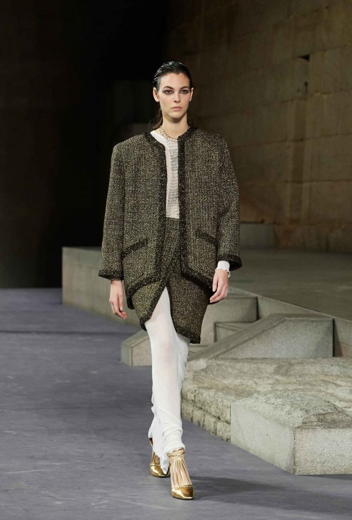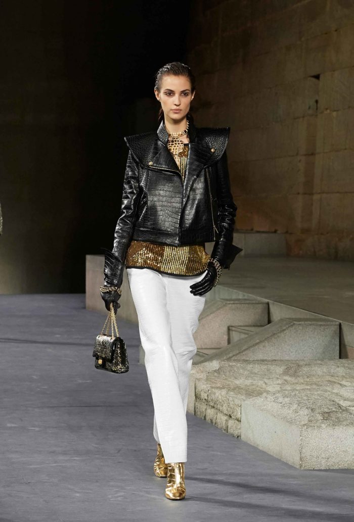 Entre las siluetas clásicas, una serie de looks mostraron un Chanel para una mujer más joven, pensemos en Lily Rose Depp por ejemplo. Una biker jacket con hombreras pronunciadas, unos pantalones de cuero y un vestido metálico desfilaron la pasarela. Haciéndonos pensar que si David Bowie siguiera con nosotros, le encantaría llevar las prendas.