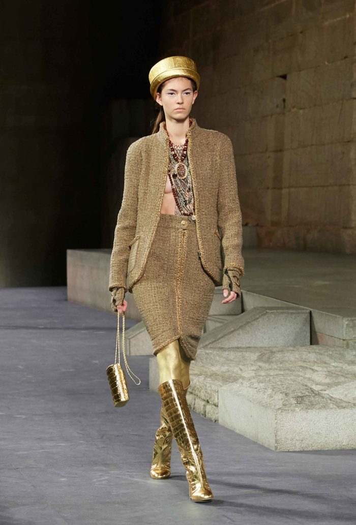 El street art, el art déco, las antigüedades y las joyas que tanto fascinaban a Coco se mostraron en camelias, medallones dorados y los bolsos. Si Coco hubiera tenido que emprender un viaje para descubrir Egipto, seguramente se colocaría su sombrero, un par de botas y se arriesgaría con el denim como lo vimos en el look que llevó Kaia Gerber para adentrarse a esa aventura.